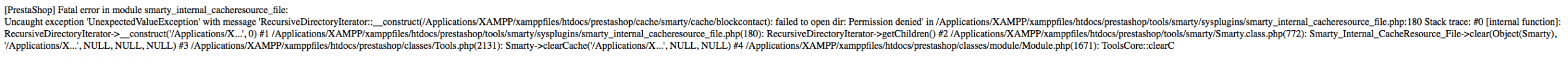 yusss1 Posted January 11, 2014 Share Posted January 11, 2014 Hola! soy nuevo en el mundillo y me ha surgido un problema, al intentar cambiar la configuracion de mi barra horrizontal de inicio en mi plantilla de leoconverse , en la configuracion de prestashop Modulos-Menu horizontal supeiror-Configuracion cuando intento guardar algun cambio me salta el siguiente mensaje en una nueva pantalla [PrestaShop] Fatal error in module smarty_internal_cacheresource_file:Uncaught exception 'UnexpectedValueException' with message 'RecursiveDirectoryIterator::__construct(/Applications/XAMPP/xamppfiles/htdocs/prestashop/cache/smarty/cache/blockcontact): failed to open dir: Permission denied' in /Applications/XAMPP/xamppfiles/htdocs/prestashop/tools/smarty/sysplugins/smarty_internal_cacheresource_file.php:180 Stack trace: #0 [internal function]: RecursiveDirectoryIterator->__construct('/Applications/X...', 0) #1 /Applications/XAMPP/xamppfiles/htdocs/prestashop/tools/smarty/sysplugins/smarty_internal_cacheresource_file.php(180): RecursiveDirectoryIterator->getChildren() #2 /Applications/XAMPP/xamppfiles/htdocs/prestashop/tools/smarty/Smarty.class.php(772): Smarty_Internal_CacheResource_File->clear(Object(Smarty), '/Applications/X...', NULL, NULL, NULL) #3 /Applications/XAMPP/xamppfiles/htdocs/prestashop/classes/Tools.php(2131): Smarty->clearCache('/Applications/X...', NULL, NULL) #4 /Applications/XAMPP/xamppfiles/htdocs/prestashop/classes/module/Module.php(1671): ToolsCore::clearC como veis estoy utilizando XAMPP y la estoy creando en localhost , he probado a reiniciarla , desactivarla, desinstalarla y nada, tambien he mirado el tema de permisos en los archivos que salen en el mensaje , la verdad llevo unas cuantas horas atascado , y no entiendo bien que ocurre , agradeceria vuestra ayuda Link to comment Share on other sites More sharing options...
