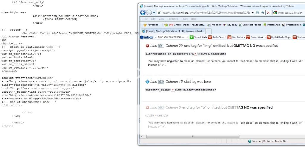 nutbuster Posted October 5, 2009 Share Posted October 5, 2009 A lot of the errors I am getting from W3C are from add on...like a page counter.Is the problem that it is not compatatable with Xhtml?Here are the W3C errors on just the counter:Here is the Link:http://validator.w3.org/check?uri=http://www.kctrading.net/&charset;=(detect+automatically)&doctype=Inline&ss=1&group=0&No200=1&verbose=1&user;-agent=W3C_Validator/1.654 Line 593, Column 30: XML Parsing Error: Opening and ending tag mismatch: img line 591 and a alt="counter on blogger" > Line 593, Column 36: XML Parsing Error: Opening and ending tag mismatch: a line 589 and div alt="counter on blogger" > Line 593, Column 47: XML Parsing Error: Opening and ending tag mismatch: div line 588 and noscript alt="counter on blogger" >587.[removed][removed]589.class="statcounter">594.<!-- End of StatCounter Code -->595. 596.597. 598.599.</body>600.</html>There has got to be an easy to decifer all of this code? Link to comment Share on other sites More sharing options...