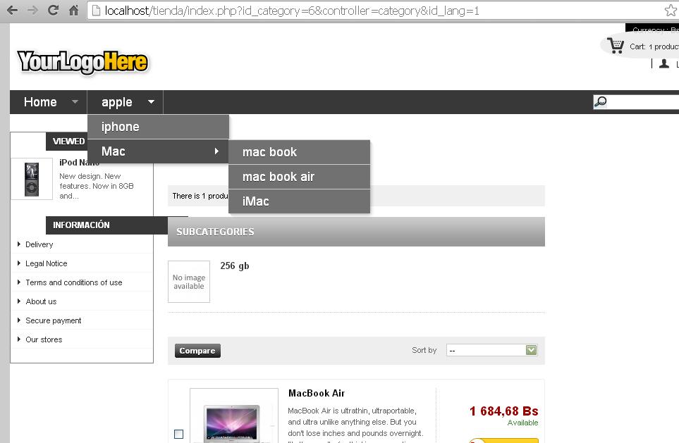 sakuragy Posted January 13, 2014 Share Posted January 13, 2014 Hola a todos Mi problema es el siguiente: tengo un menu bar que he creado con CMS, en la imagen de ejemplo que he adjuntado, se puede ver que tengo un sub menú llamado MAC y su su vez varios submenues, estos no tienen enlaces, no llevan a ningún lado. La idea es que al elegirlos lleven a las categorías en la cual se muestren los productos asociados. Ya he leído otros temas parecido pero no dan con la solución que quiero. Muchas gracias por su tiempo Link to comment Share on other sites More sharing options...