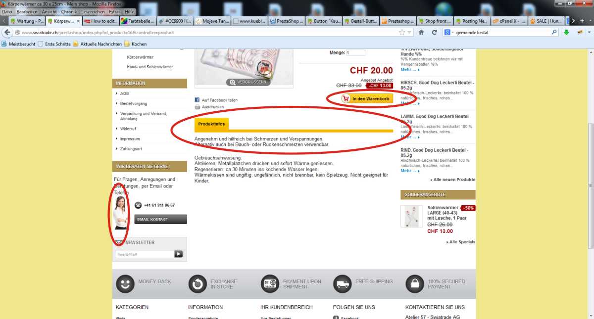 cacib0 Posted January 15, 2014 Share Posted January 15, 2014 Produktinfo, Bild Frau mit Headset, Symbole Footer Guten Tag, bitte um Hilfestellung von 3 Problemen, davon 1 selbst gemacht. 1. Ich wollte die Farbe des Buttons "in den Korb" von gelb auf grau ändern. Nach meheren Versuchen habe ich einen Farbwert falsch geändert, jetzt ist der Button Produktinformation gelb unterlegt. Natürlich weiss ich nicht mehr in welcher Datei ich dies "verbrochen " habe und bitte um Hilfe zur Rückstellung in die urspüngliche Farbe. 2. Im weiteren möchte ich das Bild "Frau mit Headset bei "kontaktieren Sie uns" entfernen 3. ich möchte die 5 Symbole und Texte im Footer entfernen, z.B. Smilebild mit Moneyback, Exchange in Store etc. Herzlichen Dank für Eure Unterstützung, cacib0 Prestashop: 1.5.6.1, Screenshot im Anhang Link to comment Share on other sites More sharing options...