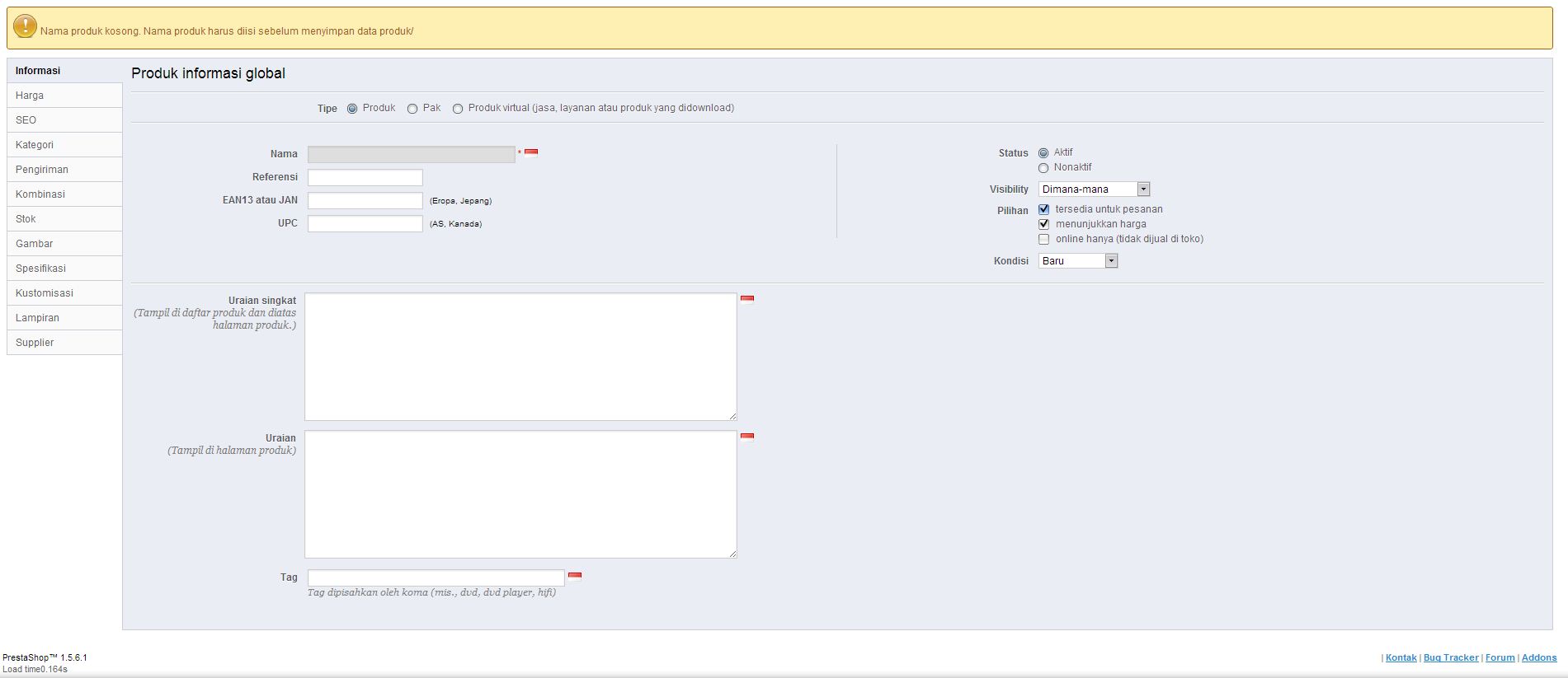 MFajriRamdhani Posted January 17, 2014 Share Posted January 17, 2014 Hallo Master" Prestashop saya baru buat website pakai prestashop 1.5.6.1 tapi kok gak bisa add product ya ? Selalu pas baru klik mau tambah produk muncul warning "Nama produk kosong. Nama produk harus diisi sebelum menyimpan data produk/" dan field nama produk terkunci kira kira kenapa ya ? mohon bantuannya ya untuk para master prestashop pic terlampir Link to comment Share on other sites More sharing options...
