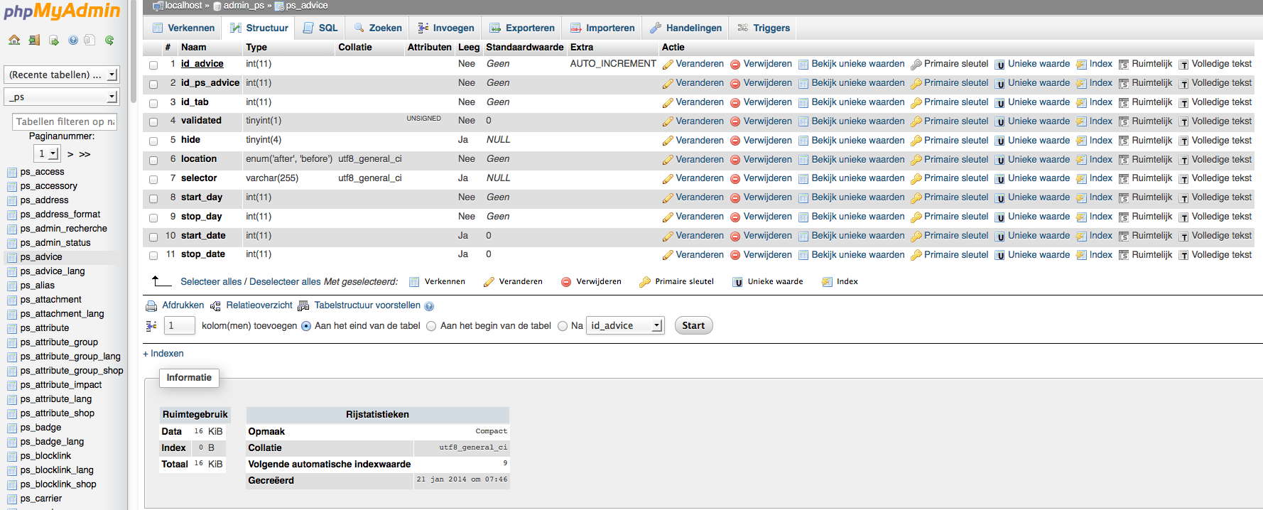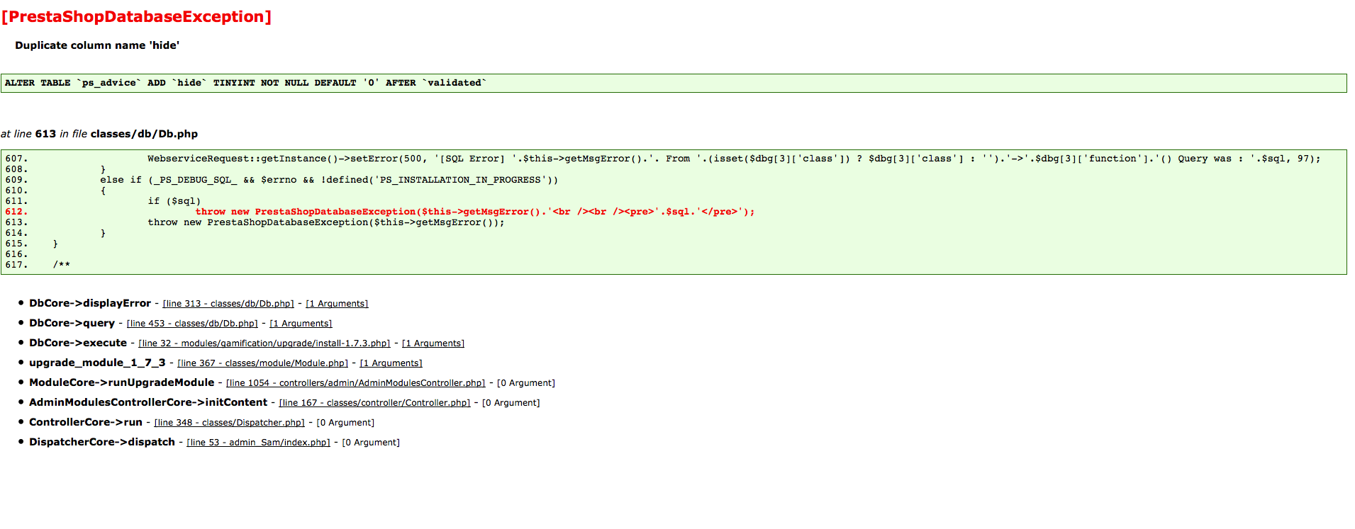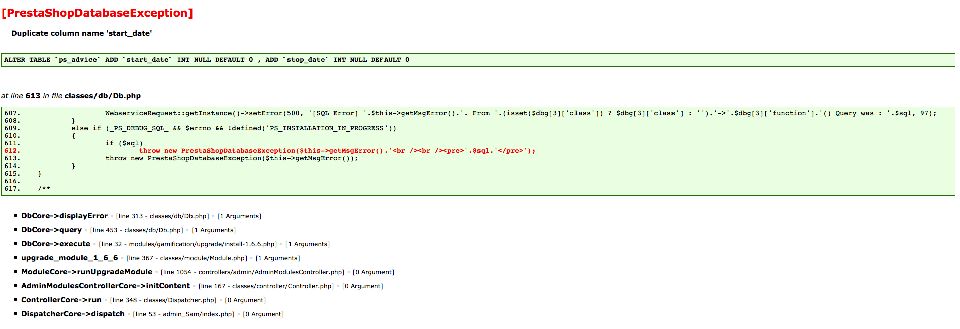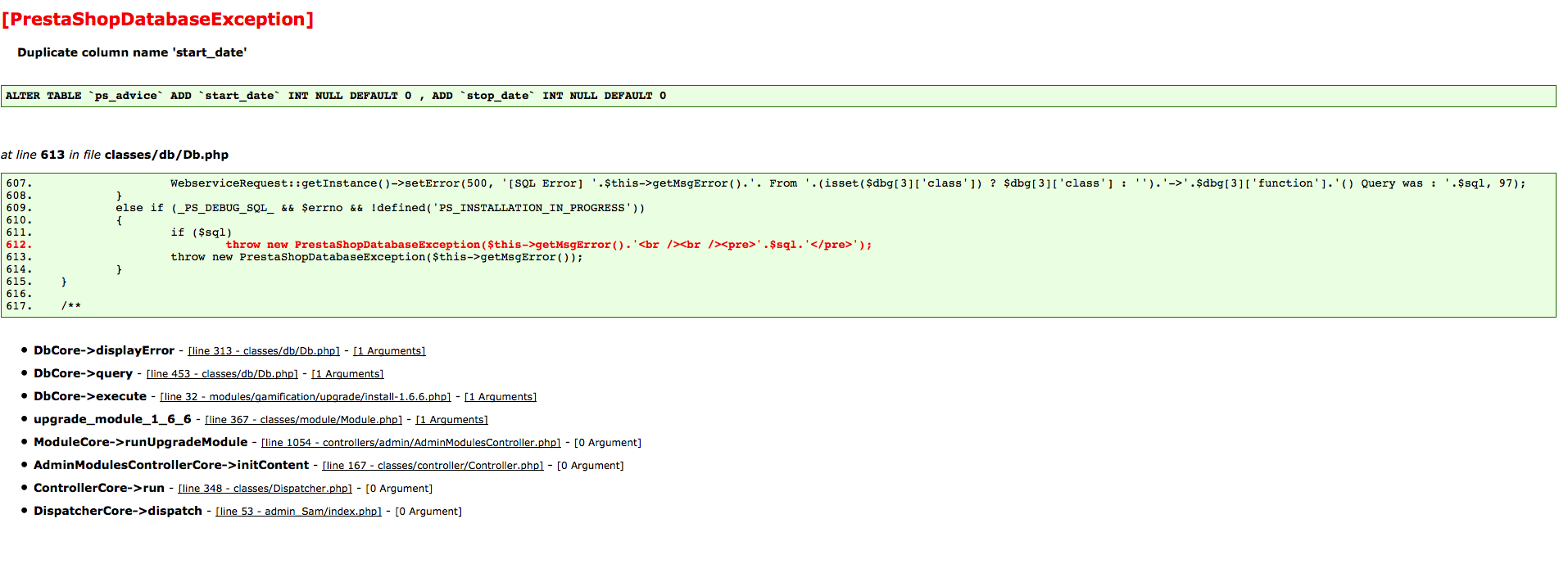Optimus_Sam Posted January 21, 2014 Share Posted January 21, 2014 (edited) Hi everyone, I have this error when i click on my modules tab in BO: ALTER TABLE `ps_advice` ADD `start_date` INT NULL DEFAULT 0 , ADD `stop_date` INT NULL DEFAULT 0 Here's a screenshot: The thing is that i've tried adding start_date and stop_date but hasn't worked. Don't know why yet This is how PHPmyAdmin looks like: Anyone have an idea? Don't know what i have to do regarding the duplicate column thing and 'alter table'... Kind regards, Sam Edited January 22, 2014 by Optimus_Sam (see edit history) Link to comment Share on other sites More sharing options...