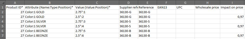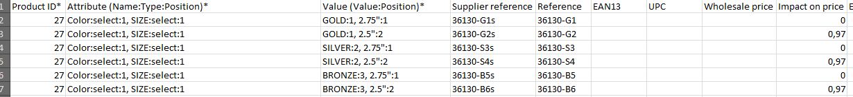raptor_00 Posted January 21, 2014 Share Posted January 21, 2014 (edited) Hola, tengo una duda en cuanto a la creación de varias combinación en el csv. la idea es la siguiente, yo tengo productos que son medallas (oro, plata y bronce) yo cree en el combinations_import.csv la siguiente estructura: ...adjunto img pero yo necesito que por cada medalla exista la combinacion de tamaño, pero cada medalla va a tener dos o tres medidas, por ejemplo el oro tendrá los tamaños de 2 y 4 pulgadas y de acuerdo al tamaño tendra una variacion en el precio. la pregunta es como puedo declarar esto aqui en el csv.....??? yo intente algo asi para darle la opcion de una medida pero neesito ponerle dos o tres medidas. ...adjunto img como lo hago..?? Edited January 24, 2014 by raptor_00 (see edit history) Link to comment Share on other sites More sharing options...