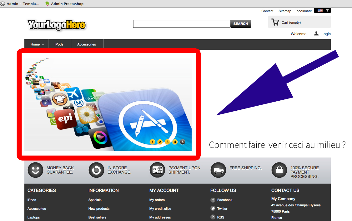 keving Posted January 26, 2014 Author Share Posted January 26, 2014 je pense que ce du parceque vous n'avez pas des colonne gauche se pour ça le slider se décale vers la gauche! si non vous truverai le fichier css dans /modules/homeslider esq vous avez un url? Merci pour votre réponse ! Je le retravaille actuellement en local avec MAMP, je n'ai donc pas d'URL. J'ai en fait retiré tous les modules en laissant les plus importants pour moi, c'est à dire : - Logo - Search - Cart - Language selector - Login - Superfish Menu - HomeSlider - Footer J'ai en effet bien identifié le CSS dans lequel j'ai essayé de mettre un peu partout <center> afin de voir le résultat mais rien n'y fait ... Un autre piste ? Kevin. Link to comment Share on other sites More sharing options...