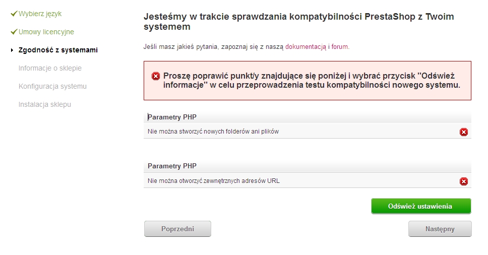 vekia Posted January 26, 2014 Share Posted January 26, 2014 1) wygląda na to, że nie wszystkie foldery mająodpowiednie uprawnienia lista folderów którym nalezy nadać odpowiednie uprawnienia: http://doc.prestashop.com/display/PS15/Installing+PrestaShop 2) Twoje konto hostingowe uniemożliwia korzystanie z funkcji get_file_contents lub cURL, jedno z nich musi być aktywne, zapytaj usługodawcę, bo my możemy jedynie gdybać Link to comment Share on other sites More sharing options...