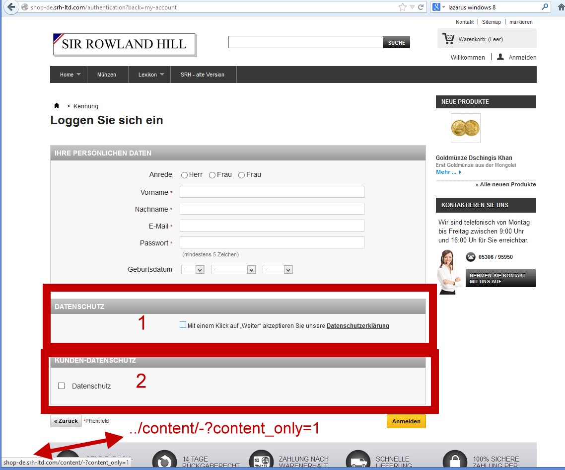 DirkL Posted January 27, 2014 Share Posted January 27, 2014 (edited) Hallo an alle Ich habe zum einen ein Problem mit den vorgegebenen Links zum Datenschutz im Kundenlogin und Warenkorb und zum anderen ein Verständnisproblem zum Kundenschutz im Warenkorb. Der angehängte Screenshot zeigt die Login-Maske. Wozu nutzt man Block 2 ? Den Block 2 habe ich mit dem Eintrag "Datenschutz" in Block Kundendatenschutz angelegt. Ich sehe nur nicht den Sinn dieses Blocks, weil Block Nr 1 fest vorgegeben ist. Link Datenschutzerklärung in Block 1: funktioniert nicht, weil in der URL zwischen den beiden "content" die Zieladresse fehlt bzw. ein "-" ist. Das lezte Problem habe ich auch beim Bestellvorgang (2. Screenschot ) : Bestellung prüfen/Übersicht ( ich nutze GC German)Möglicher Weise liegt es daran, dass ich den bei der Installation vorgegebenen Datenschutz-CMS gelöscht habe. Nur, wie lege ich den dann wieder an?Danke im VorausDirk Edited January 27, 2014 by DirkL (see edit history) Link to comment Share on other sites More sharing options...