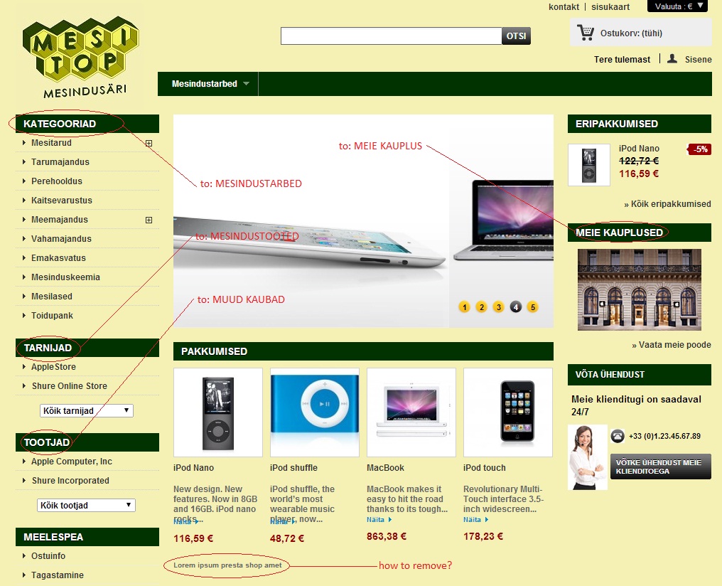 Mesitop Posted January 27, 2014 Share Posted January 27, 2014 It must be very simple... but I'm tired and out of ideas... How would it be possible to change the name(s) of blocks: categories suppliers etc.? They need to be changed like: KATEGOORIAD (categories) => MESINDUSTARBED TARNIJAD (suppliers) => MESINDUSTOOTED TOOTJAD (manufactures) => MUUD KAUBAD MEIE KAUPLUSED kauplused => MEIE KAUPLUS + Lorem ipsum presta shop amet - to be removed Thanks in advance! Link to comment Share on other sites More sharing options...