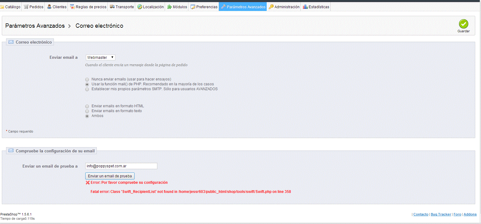 Bolonia Posted January 29, 2014 Share Posted January 29, 2014 Hi teamates , how r u todey?I come to here to find some help , because i have this problem.I m searching abot this error , and i dont have solution. I think the problems is the DB , because i change my domain to other. maybe the fix is there.If u enter to the web www.poppyspet.com.ar and send mail in contact! u se the next error Fatal error: Class 'Swift_RecipientList' not found in /home/jessr603/public_html/shop/classes/Mail.php on line 131 I add a photo when i check send a mail , in BO Advance/email options.Any1 can helpme whit this ?Thanks a lot. Jon @ sry my english is no very good , i hope u can understandme! Hola amigos , como estan?bueno vengo nuevamente al foro ya que no puedo dar con este problema , estuve investigando y aparentemente es un problema de DB pero la verdad no encuentro donde puede estar la falla.Migre la tienda de servidor y ahora no envia mails. Si envio un mail por contactos me aparece este error : Fatal error: Class 'Swift_RecipientList' not found in /home/jessr603/public_html/shop/classes/Mail.php on line 131 Y en el BO me aparece el error de la imagen! La tienda es www.poppyspet,com,.arDesde ya agradesco toda la ayuda que me puedan brindar! @ Digo yo que parece como un error de BD por que no puede encontrar la linea , nose me parece a mi Link to comment Share on other sites More sharing options...