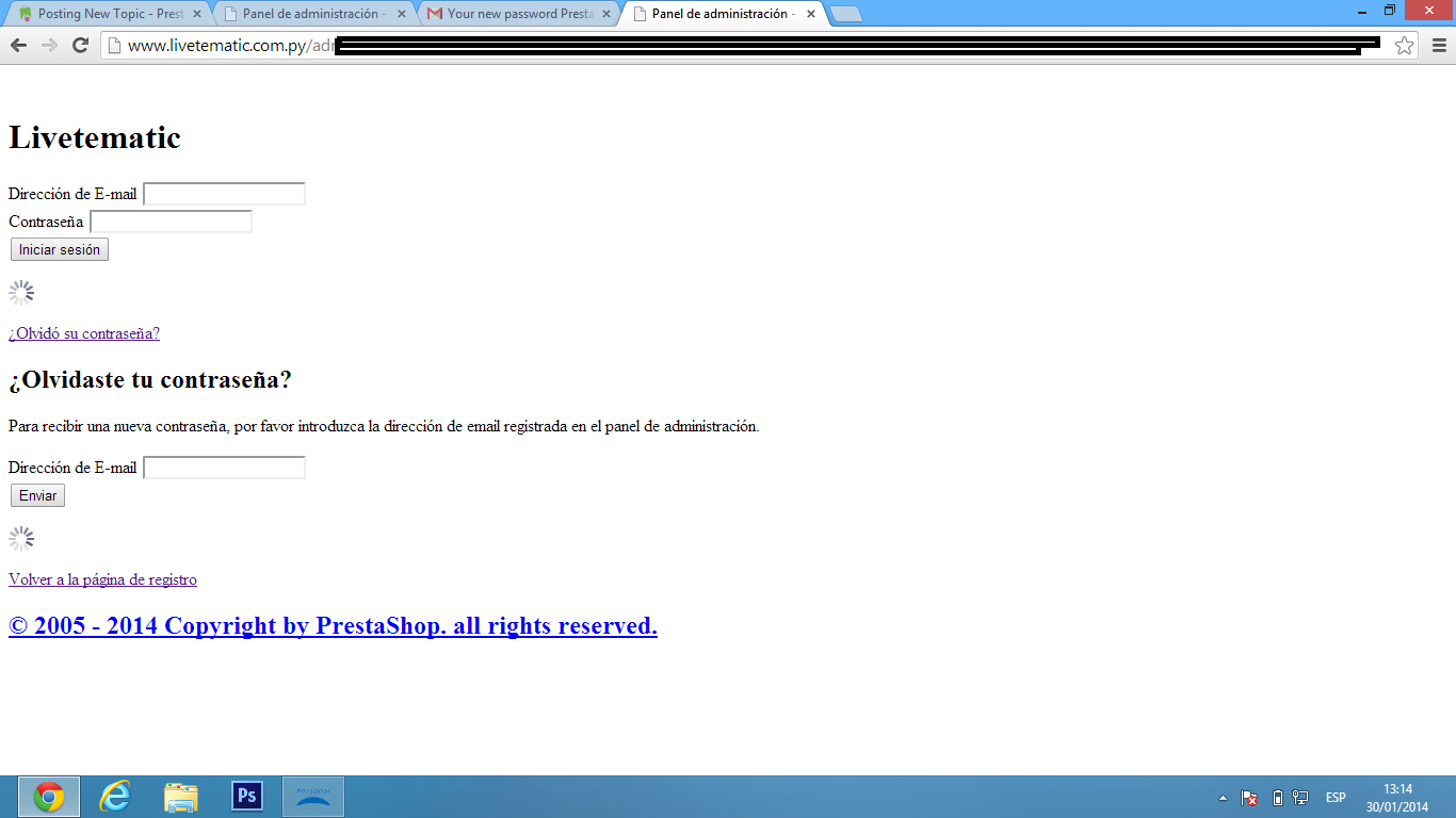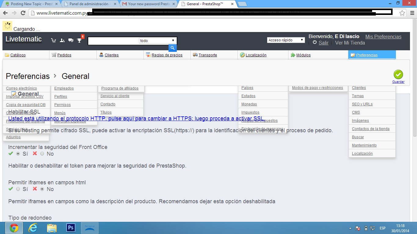 ogcerezo Posted February 6, 2014 Share Posted February 6, 2014 Hola! Acabo de instalar presta shop en mi tienda, toda la instalacion se realizo correctamente. Pero luego cuando ingreso en el panel me parece todo desordenado y con falta de aspectos visuales, les muestro imagenes para que puedan ver: Que recomendaciones me pueden dar? cual creen que es el origen del problema? La tienda lleva solo 30 minutos en linea Hola has probado con otro navegador como firefox? Probaste como te sugiere el link en modo seguro(https)? ya me dirás Link to comment Share on other sites More sharing options...