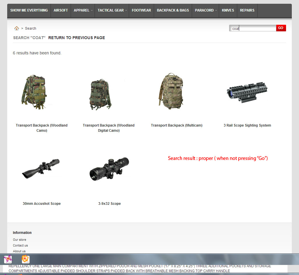 Richieh Posted January 30, 2014 Share Posted January 30, 2014 Site: IcebergArmyNavy.com Issue : When Typing in the search box, whether it be a error or a product, pressing "go" gives me a broken page. The navigation style disappears and the search result does not come out as it should. HOWEVER : When searching for an item and NOT press go, it will automatically redirect and the search result comes out correctly. I have spoken with my hosting and they have told me that the possible reason is because the my directory cache/structure is not finding the img files it has saved. So they have told me it can due to my new product images not be jpg. as for The image files I have recently started uploading product images in PNG files as it looks neater. I know prestashop supports PNG and activated PNG in preference > Images. I've also tried clearing my cache manually but still exists. Any Ideas on how I can get this fixed? Thank you. Link to comment Share on other sites More sharing options...