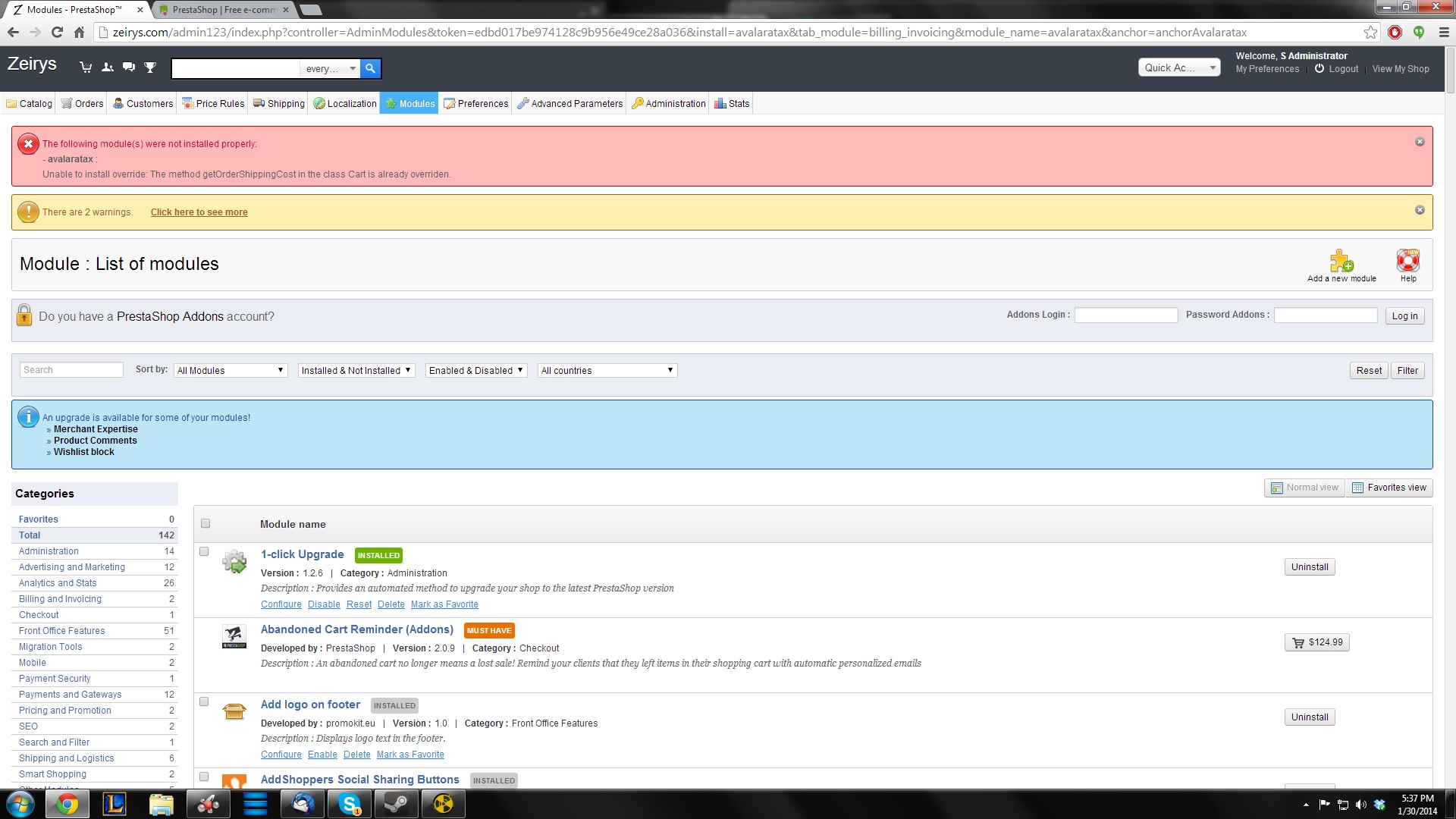 Issue has been solved with a clean install of prestashop.  Now my Avalara is not calculating sales tax although I am a registered Avalara member, and have put in all my information correctly as a specialist from Avalara has helped me set it up.  Any idea what might be the problem and how to fix this?