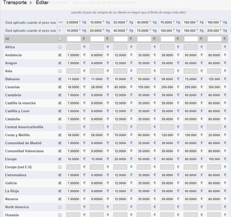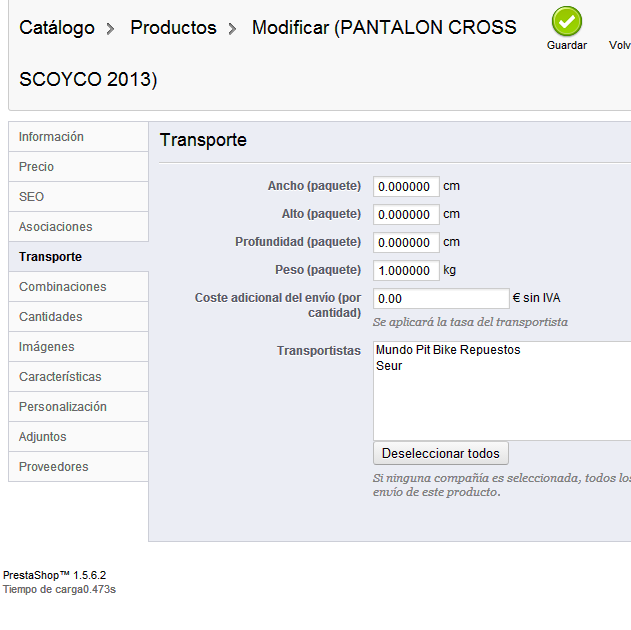 dglucero Posted February 3, 2014 Share Posted February 3, 2014 Buenas! En estos momentos estoy configurando una tienda virtual y me he topado con un problema relacionado con el tema del envío. Tengo dados de alta los precios de envío por cada zona geográfica y por cada rango de peso, según cada transportista. A la hora de hacer pruebas con un pedido realizado por un cliente ficticio, me asalta la siguiente duda: ¿Es capaz el carrito de calcular el peso del pedido para asignarle un gasto de envío u otro, en función de lo que pesa? Ejemplo ficticio De 0 a 2 kg. Precio de envío: 6 euros De 2 a 5 kg. Precio de envío 8 euros Si he hecho un pedido de varios artículos de diferentes pesos y el peso final del carrito es de 3'5 kg, ¿El carrito entendería que hay que asignarle unos gastos de envío de 8 euros? Entiendo que de ser así, habría que ir asignando a cada producto su peso, pero, ¿en qué apartado concreto se tendría que hacer en Prestashop?. Estoy utilizando la versión 1.5.6.2 Espero que se haya entendido Muchas gracias de antemano por vuestras respuestas Link to comment Share on other sites More sharing options...