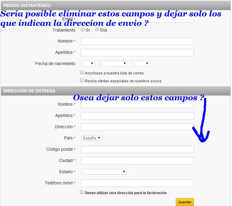 F.CASTRO Posted February 5, 2014 Share Posted February 5, 2014 (edited) Hola ! Estoy intentando reducir el registro de datos al realizar una compra como invitado y estoy ya saturado y no consigo solucionarlo Espero que entendais lo que quisiera hacer tras ver las imajenes: Al realizar un pedido como invitado Seria posible eliminar los primeros campos y dejar solo los segundos ? Solicito vuestra ayuda y os doy las gracias de antemano Edited February 5, 2014 by F.CASTRO (see edit history) Link to comment Share on other sites More sharing options...