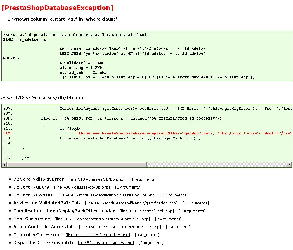 tyszek Posted February 5, 2014 Share Posted February 5, 2014 Witam, Na całe szczęście na localu się to stało Kombinowałem sobie z wyświetlaniem cech na karcie produktu i nagle bum, bam i jeb....o ;/Strona działa, tylko do panelu admina nie mogę wejść.Restartowałem serwer, wgrywałem tabele jakie są w błędzie wyświetlone, wgrywałem całą bazę.Nadal nic ;/Znalazłem info o tym błędzie i rozwiązywali go go aktualizując moduł supertabextra czy jakoś tak. Problem w tym że ja nie mam tego modułu ;/Ktoś ma jakiś pomysł gdzie szukać przyczyny?Poniżej całość tego co się wyświetla: PrestaShopDatabaseException] Unknown column 'a.start_day' in 'where clause' SELECT a.`id_ps_advice`, a.`selector`, a.`location`, al.`html` FROM `ps_advice` a LEFT JOIN `ps_advice_lang` al ON al.`id_advice` = a.`id_advice` LEFT JOIN `ps_tab_advice` at ON at.`id_advice` = a.`id_advice` WHERE ( a.`validated` = 1 AND a.`hide` = 0 AND al.`id_lang` = 1 AND at.`id_tab` = 1 AND ((a.`start_day` = 0 AND a.`stop_day` = 0) OR (05 >= a.`start_day` AND 05 <= a.`stop_day`))) at line 613 in file classes/db/Db.php 607. WebserviceRequest::getInstance()->setError(500, '[SQL Error] '.$this->getMsgError().'. From '.(isset($dbg[3]['class']) ? $dbg[3]['class'] : '').'->'.$dbg[3]['function'].'() Query was : '.$sql, 97); 608. } 609. else if (_PS_DEBUG_SQL_ && $errno && !defined('PS_INSTALLATION_IN_PROGRESS')) 610. { 611. if ($sql) 612. throw new PrestaShopDatabaseException($this->getMsgError().'<br /><br /><pre>'.$sql.'</pre>'); 613. throw new PrestaShopDatabaseException($this->getMsgError()); 614. } 615. } 616. 617. /** DbCore->displayError - [line 313 - classes/db/Db.php] - [1 Arguments] DbCore->query - [line 488 - classes/db/Db.php] - [1 Arguments] DbCore->executeS - [line 96 - modules/gamification/classes/Advice.php] - [1 Arguments] Advice::getValidatedByIdTab - [line 155 - modules/gamification/gamification.php] - [1 Arguments] Gamification->hookDisplayBackOfficeHeader - [line 473 - classes/Hook.php] - [1 Arguments] HookCore::exec - [line 1871 - classes/controller/AdminController.php] - [2 Arguments] AdminControllerCore->init - [line 150 - classes/controller/Controller.php] - [0 Argument] ControllerCore->run - [line 348 - classes/Dispatcher.php] - [0 Argument] DispatcherCore->dispatch - [line 53 - tyszek/index.php] - [0 Argument] Wygląda to tak: http://www.prestashop.com/forums/uploads/monthly_01_2014/post-506666-0-27393800-1389978907.jpg Zmieniana była tylko zawartość pliku product.tpl i nic więcej. Link to comment Share on other sites More sharing options...