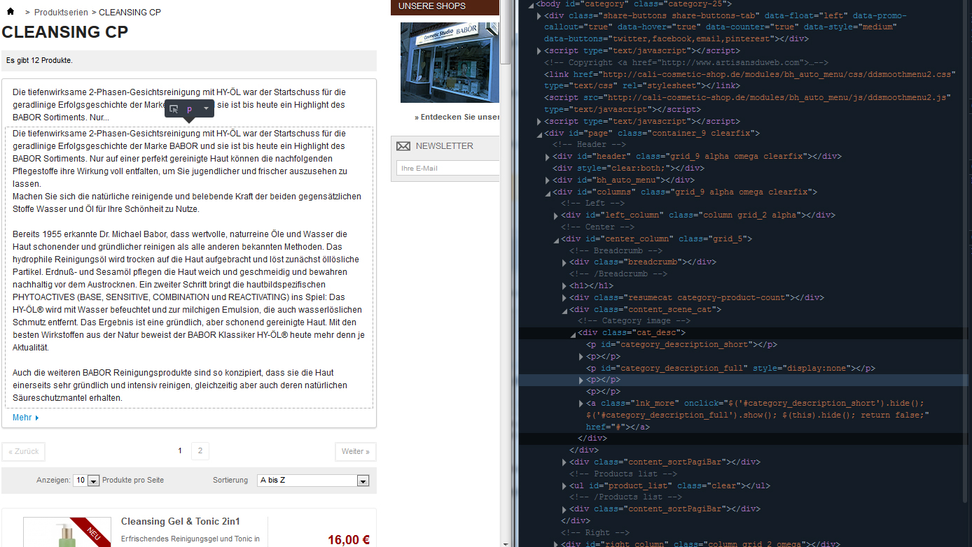 calicosmeticshop Posted February 7, 2014 Author Share Posted February 7, 2014 (edited) Tut mir Leid das ich eine so große Inkompetenz durch den Raum gehen lasse, aber irgendwie will der Shop nicht. Ich habe sogar einen Mann vom Fach gefragt und der meint das der Shop es theoretisch richtig anzeigen müsste, weil der Code eigentlich richtig ist. Hier habe ich drei Screens. Der 1. und 2. Bild beinhalten deinen korrigierten Code und zwar einmal nach dem Aufrufen und nach dem klick auf "Mehr" (More) Das 3. Bild einhaltet deinen Code ohne truncate unter description_full, siehe hier Zeile 5: {if $category->description} <div class="cat_desc"> {if strlen($category->description) > 200} <p id="category_description_short">{$category->description|truncate:200:'...'}</p> <p id="category_description_full" style="display:none">{$category->description}</p> <a href="#" onclick="$('#category_description_short').hide(); $('#category_description_full').show(); $(this).hide(); return false;" class="lnk_more">{l s='More'}</a> {else} <p>{$category->description|truncate:300:'...'}</p> {/if} Ich hoffe ich kann dir mein Problem verständlich vermitteln. Wenn irgendetwas unverständlich ist bitte fragen. Und vielen Dank für deine Hilfe! Edited February 7, 2014 by calicosmeticshop (see edit history) Link to comment Share on other sites More sharing options...