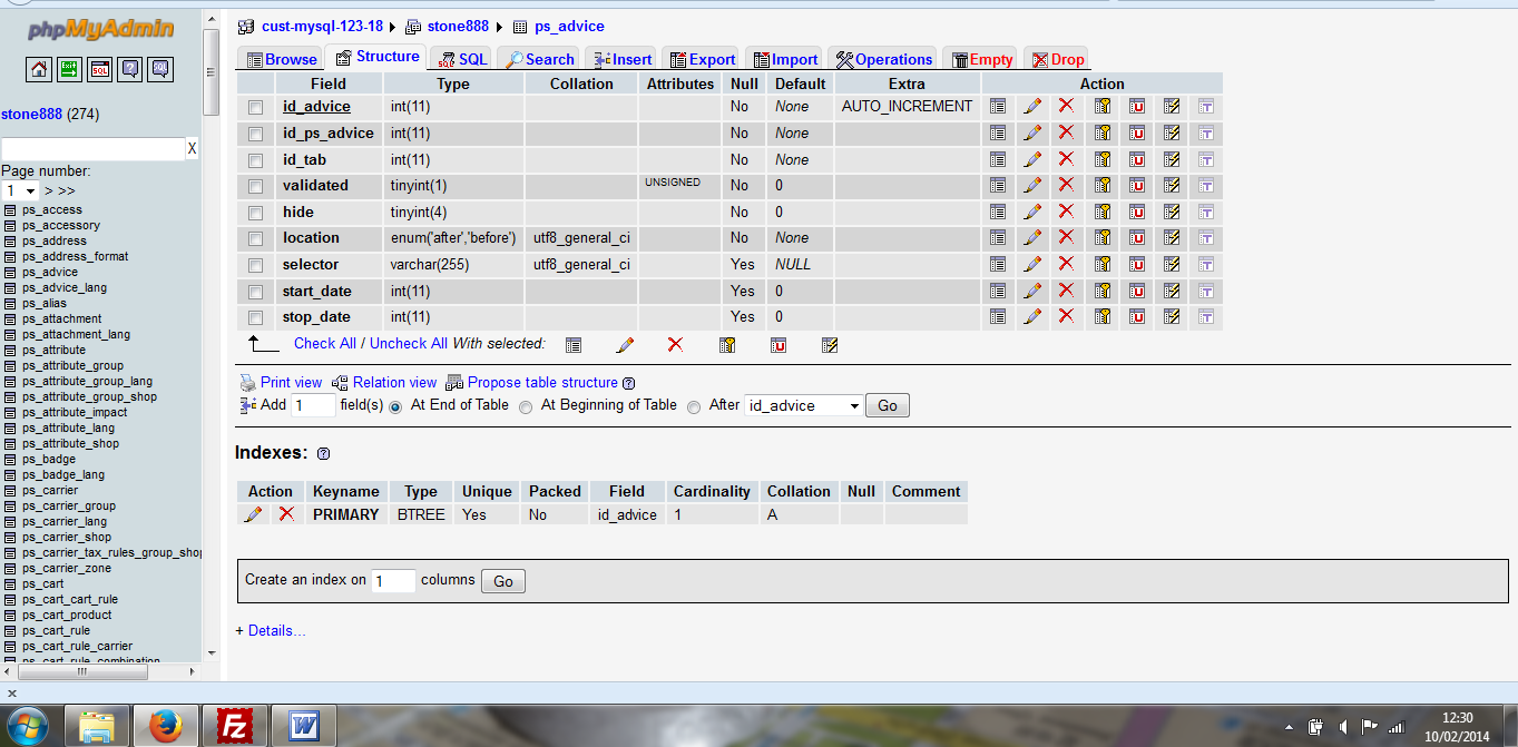 mexicoMATT Posted February 10, 2014 Author Share Posted February 10, 2014 Hi Vekia, Thanks for your advice. Here's what I have done : Firstly) turned off Module updates in Back office. 2nd) I have re-installed the gamification folder with the original PS version for 1.5.4.1. 3rd) Checked the php Database, and tried to create 'hide' column in ps_advice folder , but cannot create as it already exists. Not sure what to do now, is there something in the table that needs to added/deleted? I have attached a screenshot of the 'ps_advice' structure as it stands. Does anything look wrong there? Very much appreciate the help you are offering. Matt. Link to comment Share on other sites More sharing options...