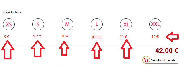 LAGARTERANA Posted July 18, 2017 Share Posted July 18, 2017 Mis productos tienen 10 tallas y necesito poner un precio distinto para cada talla. Ejemplo: Talla S - 10€ Talla L - 15€ Talla XL - 20€ Talla XXL- 25€ ¿Cómo se puede hacer? Gracias Link to comment Share on other sites More sharing options...