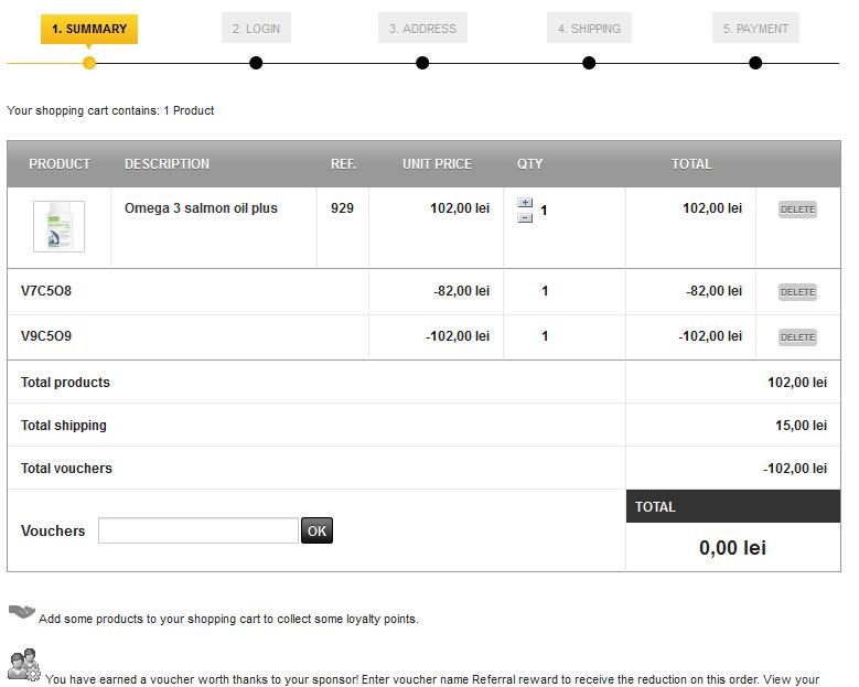 Dudace Posted February 10, 2014 Share Posted February 10, 2014 When adding 2 vouchers in the cart (total vouchers value higher than the order + shipping) the total to pay by the customer gets to ZERO. This is abnormal in 2 ways: the vouchers shall not cover the shipping cost as defined in the price rules (this is not an available setting); the system only uses from the vouchers the amount necessary to cover the products from the cart; this way the shipping cost is not covered in any way. I am using the new V.1.5.6.2. Any solution please? Link to comment Share on other sites More sharing options...