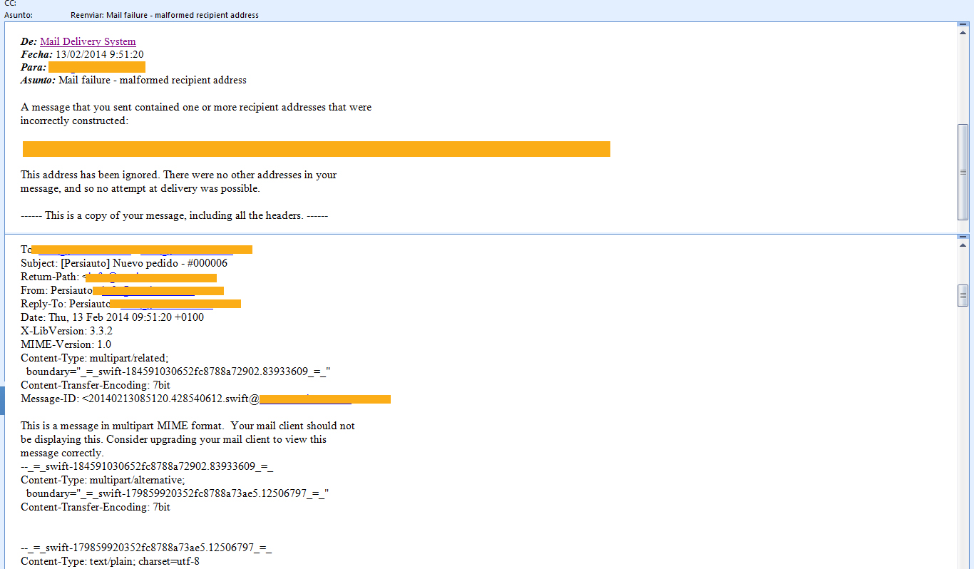 juanrojas Posted February 13, 2014 Share Posted February 13, 2014 Presento el siguiente error en mi tienda cuando alguien compra (imagen cliente) le llega el correo de forma organizada y logica, pero a mi como administrador me llega de una manera desordenada (imagen admin) y en el correo llega de Mail Delivery System, al cliente si le llega de mi correo. que debo hacer? para que me llegue el correo de confirmación de forma organizada, como le llega al cliente tengo version de prestashop 1.5.6.0 y uso modulo Alertas por correo version 2.4 Link to comment Share on other sites More sharing options...