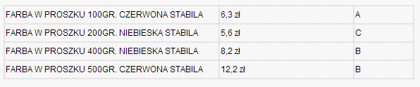 0 Lateraluspl Posted February 14, 2014 Author Share Posted February 14, 2014 (edited) Chce dodac taki cennik do sklepu. A 5% B10% C15% NAZWA CENA RABAT FARBA W PROSZKU 100GR. CZERWONA STABILA 6,3 zł A FARBA W PROSZKU 200GR. NIEBIESKA STABILA 5,6 zł C FARBA W PROSZKU 400GR. NIEBIESKA STABILA 8,2 zł B FARBA W PROSZKU 500GR. CZERWONA STABILA 12,2 zł B sklep ma to zaimportowac i wg tabeli trzeciej ustawic rabatowania, wg wczesniej podanych. Pozniej oczywiscie bede ustawial np. A dla hurtu wiecej dla detalu mniej i tak ze wszystkimi. Myślę, że teraz jasniej opisalem Edited February 17, 2014 by Lateraluspl (see edit history) Link to comment Share on other sites More sharing options...