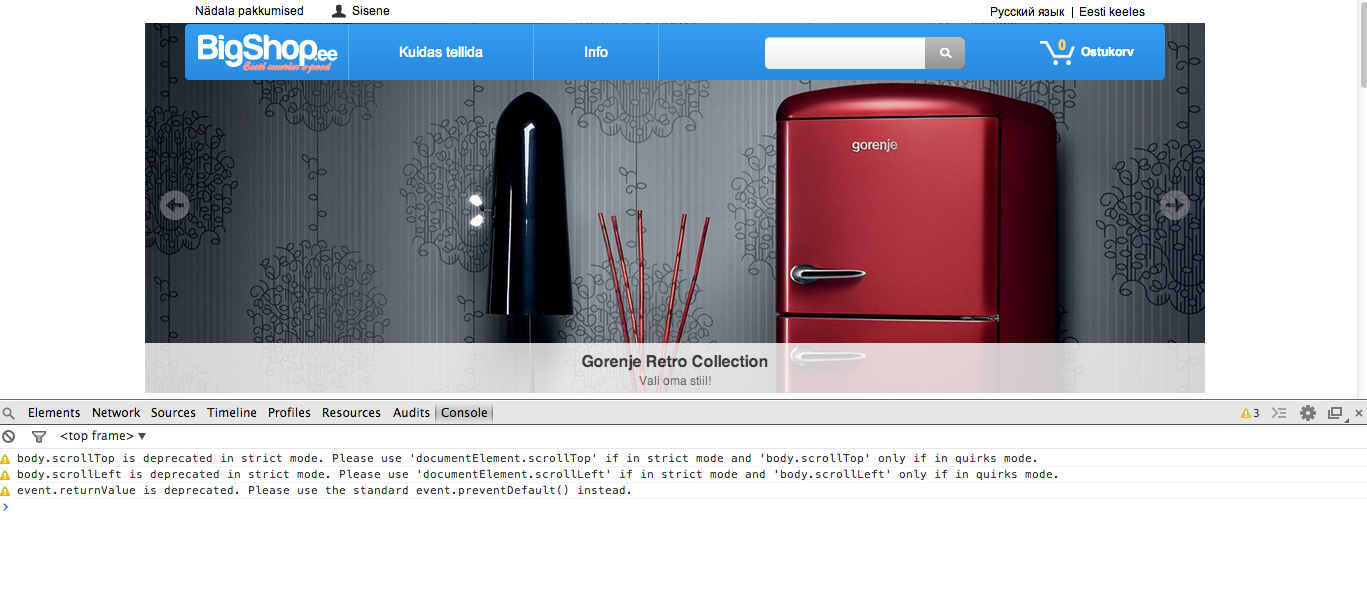 ipete Posted February 17, 2014 Share Posted February 17, 2014 Hi I tried to do something against this problem but no result I have this notifications in chrome on every page body.scrollTop is deprecated in strict mode. Please use 'documentElement.scrollTop' if in strict mode and 'body.scrollTop' only if in quirks mode. body.scrollLeft is deprecated in strict mode. Please use 'documentElement.scrollLeft' if in strict mode and 'body.scrollLeft' only if in quirks mode. event.returnValue is deprecated. Please use the standard event.preventDefault() instead. Link to comment Share on other sites More sharing options...