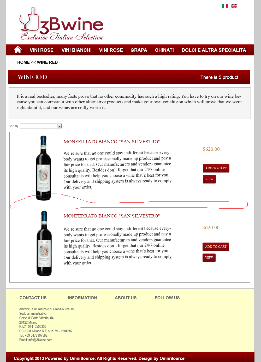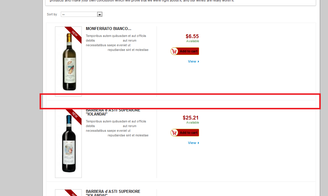 vekia Posted February 18, 2014 Share Posted February 18, 2014 ohhh you're right it's not the same as on image you attached before in your product_list.tpl add </div><div class="mythinline"></div> like i show below: add it right after <div class="right_block"></div> <li class="ajax_block_product alternate_item clearfix"> <div class="left_block"> </div> <div class="center_block"> <a href="http://www.3bwine.com/CRISTY/prestashop/index.php?id_product=4&controller=product" class="product_img_link" title="BARBERA d`ASTI SUPERIORE "IOLANDAI""> <img src="http://www.3bwine.com/CRISTY/prestashop/img/p/3/4/34-home_default.jpg" alt="BARBERA d`ASTI SUPERIORE "IOLANDAI"" title="BARBERA d`ASTI SUPERIORE "IOLANDAI"" width="90" height="239"> <!--<span class="new">New</span>--> </a> <h3><a href="http://www.3bwine.com/CRISTY/prestashop/index.php?id_product=4&controller=product" title="BARBERA d`ASTI SUPERIORE "IOLANDAI"">BARBERA d`ASTI SUPERIORE "IOLANDAI"</a></h3> <p class="product_desc"><a href="http://www.3bwine.com/CRISTY/prestashop/index.php?id_product=4&controller=product" title="Temporibus autem quibusdam et aut officiis debitis aut rerum necessitatibus saepe eveniet ut repudiandae sint et molestiae">Temporibus autem quibusdam et aut officiis debitis aut rerum necessitatibus saepe eveniet ut repudiandae sint et molestiae</a></p> </div> <div class="right_block"> <div class="content_price"> <span class="price" style="display: inline;">$25.21</span><br> <span class="availability">Available</span> </div> <a class="button ajax_add_to_cart_button exclusive" rel="ajax_id_product_4" href="http://www.3bwine.com/CRISTY/prestashop/index.php?controller=cart&add=1&id_product=4&token=07e41ecd1ac5c3db65f61da01f826ee9" title="Add to cart"><span></span>Add to cart</a> <a class="button lnk_view" href="http://www.3bwine.com/CRISTY/prestashop/index.php?id_product=4&controller=product" title="View">View</a> </div><div class="mythinline"></div> </li> in css styles use this: #product_list .mythinline { width: 95%; height: 1px; display: block; border-bottom: 1px solid #c0c0c0; margin: -20px auto; position: relative; bottom: 0px; } effect Link to comment Share on other sites More sharing options...