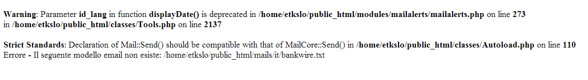 giuliopowa Posted February 19, 2014 Author Share Posted February 19, 2014 mi esce anche questo nel back office -- > moduli Warning: file_put_contents(/home/etkslo/public_html/img/tmp/f76538e261e8009140af89e001341f17.jpg) [function.file-put-contents]: failed to open stream: No such file or directory in /home/etkslo/public_html/classes/module/Module.php on line 1199Warning: copy(/home/etkslo/public_html/img/tmp/f76538e261e8009140af89e001341f17.jpg) [function.copy]: failed to open stream: No such file or directory in /home/etkslo/public_html/classes/module/Module.php on line 1200Warning: file_put_contents(/home/etkslo/public_html/img/tmp/ce2a60ad10c67af43abbf94d43e256eb.jpg) [function.file-put-contents]: failed to open stream: No such file or directory in /home/etkslo/public_html/classes/module/Module.php on line 1199Warning: copy(/home/etkslo/public_html/img/tmp/ce2a60ad10c67af43abbf94d43e256eb.jpg) [function.copy]: failed to open stream: No such file or directory in /home/etkslo/public_html/classes/module/Module.php on line 1200Warning: file_put_contents(/home/etkslo/public_html/img/tmp/9f1b4bc5c99213aa75d9faac0f1a6e95.jpg) [function.file-put-contents]: failed to open stream: No such file or directory in /home/etkslo/public_html/classes/module/Module.php on line 1199Warning: copy(/home/etkslo/public_html/img/tmp/9f1b4bc5c99213aa75d9faac0f1a6e95.jpg) [function.copy]: failed to open stream: No such file or directory in /home/etkslo/public_html/classes/module/Module.php on line 1200Warning: file_put_contents(/home/etkslo/public_html/img/tmp/4fbd22dd3dfa0ed7b202872fe28a3802.jpg) [function.file-put-contents]: failed to open stream: No such file or directory in /home/etkslo/public_html/classes/module/Module.php on line 1199Warning: copy(/home/etkslo/public_html/img/tmp/4fbd22dd3dfa0ed7b202872fe28a3802.jpg) [function.copy]: failed to open stream: No such file or directory in /home/etkslo/public_html/classes/module/Module.php on line 1200Warning: file_put_contents(/home/etkslo/public_html/img/tmp/04d84ed536874b39df227543c4a7cf31.jpg) [function.file-put-contents]: failed to open stream: No such file or directory in /home/etkslo/public_html/classes/module/Module.php on line 1199Warning: copy(/home/etkslo/public_html/img/tmp/04d84ed536874b39df227543c4a7cf31.jpg) [function.copy]: failed to open stream: No such file or directory in /home/etkslo/public_html/classes/module/Module.php on line 1200Warning: file_put_contents(/home/etkslo/public_html/img/tmp/addff63c706a4988d7224f623c000b90.jpg) [function.file-put-contents]: failed to open stream: No such file or directory in /home/etkslo/public_html/classes/module/Module.php on line 1199Warning: copy(/home/etkslo/public_html/img/tmp/addff63c706a4988d7224f623c000b90.jpg) [function.copy]: failed to open stream: No such file or directory in /home/etkslo/public_html/classes/module/Module.php on line 1200Warning: file_put_contents(/home/etkslo/public_html/img/tmp/23763c67134338e6a1a65c0cdacd8001.jpg) [function.file-put-contents]: failed to open stream: No such file or directory in /home/etkslo/public_html/classes/module/Module.php on line 1199Warning: copy(/home/etkslo/public_html/img/tmp/23763c67134338e6a1a65c0cdacd8001.jpg) [function.copy]: failed to open stream: No such file or directory in /home/etkslo/public_html/classes/module/Module.php on line 1200Warning: file_put_contents(/home/etkslo/public_html/img/tmp/1e41cb4ea151e8c38ead1547fe804264.jpg) [function.file-put-contents]: failed to open stream: No such file or directory in /home/etkslo/public_html/classes/module/Module.php on line 1199Warning: copy(/home/etkslo/public_html/img/tmp/1e41cb4ea151e8c38ead1547fe804264.jpg) [function.copy]: failed to open stream: No such file or directory in /home/etkslo/public_html/classes/module/Module.php on line 1200Warning: file_put_contents(/home/etkslo/public_html/img/tmp/c106b452e86091577ec1821761562509.jpg) [function.file-put-contents]: failed to open stream: No such file or directory in /home/etkslo/public_html/classes/module/Module.php on line 1199Warning: copy(/home/etkslo/public_html/img/tmp/c106b452e86091577ec1821761562509.jpg) [function.copy]: failed to open stream: No such file or directory in /home/etkslo/public_html/classes/module/Module.php on line 1200Warning: file_put_contents(/home/etkslo/public_html/img/tmp/a81f712907c46b8964f7453f7ee6583d.jpg) [function.file-put-contents]: failed to open stream: No such file or directory in /home/etkslo/public_html/classes/module/Module.php on line 1199Warning: copy(/home/etkslo/public_html/img/tmp/a81f712907c46b8964f7453f7ee6583d.jpg) [function.copy]: failed to open stream: No such file or directory in /home/etkslo/public_html/classes/module/Module.php on line 1200Warning: file_put_contents(/home/etkslo/public_html/img/tmp/729519c77806af99a512c36d0142763d.jpg) [function.file-put-contents]: failed to open stream: No such file or directory in /home/etkslo/public_html/classes/module/Module.php on line 1199Warning: copy(/home/etkslo/public_html/img/tmp/729519c77806af99a512c36d0142763d.jpg) [function.copy]: failed to open stream: No such file or directory in /home/etkslo/public_html/classes/module/Module.php on line 1200Warning: file_put_contents(/home/etkslo/public_html/img/tmp/7fa4016b7121014766626e7993ed1a8f.jpg) [function.file-put-contents]: failed to open stream: No such file or directory in /home/etkslo/public_html/classes/module/Module.php on line 1199Warning: copy(/home/etkslo/public_html/img/tmp/7fa4016b7121014766626e7993ed1a8f.jpg) [function.copy]: failed to open stream: No such file or directory in /home/etkslo/public_html/classes/module/Module.php on line 1200Warning: file_put_contents(/home/etkslo/public_html/img/tmp/06957223ae7b69dfd00fc8da2c6e0bd2.jpg) [function.file-put-contents]: failed to open stream: No such file or directory in /home/etkslo/public_html/classes/module/Module.php on line 1199Warning: copy(/home/etkslo/public_html/img/tmp/06957223ae7b69dfd00fc8da2c6e0bd2.jpg) [function.copy]: failed to op