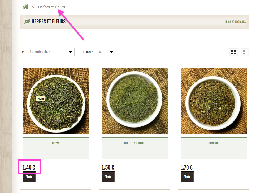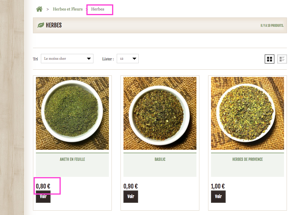 f4r4b3l Posted February 19, 2014 Share Posted February 19, 2014 Bonjour à tous, Voici ma configuration : Version de PrestaShop: 1.5.6.2 Version du logiciel serveur: Apache Version de PHP: 5.4.17-1~dotdeb.1 J'ai un produit qui comporte une déclinaison ayant un impact de prix. Mon produit est le thym. Il peut être vendu dans un sachet de 40g ou 80g. En 40g, il coûte 80cts, en 80g, il y a un impact de 60cts donc le prix final est de 1,40€ (il n'y pas de TVA donc le prix TTC = prix HT). Mon thym se trouve dans deux catégories : * Herbes & Fleurs * Herbes Sachant que la première catégorie est la mère de "Herbes". Sur la page de la catégorie Herbes, mon thym affiche bien le prix de 80cts mais dans la catégorie mère, j'ai le prix de 1,40€. Alors que la déclinaison par défaut est bien le 40g (donc 80cts). En pièce jointe, vous trouverez une capture d'écran pour chaque catégorie. Mon site est en maintenance. Cela ne me fait pas que pour le thym mais pour d'autres produits de manière aléatoire donc difficile de trouver un "fil conducteur" pour orienter mes recherches. J'ai essayé de changer de thème pour voir si le problème provenait des fichiers tpl du thème mais en prenant le thème par défaut de Prestashop, j'ai exactement la même chose. Quand je rajoute "debug" dans les fichiers tpl en smarty (certes, ce n'est pas la manière la plus propre pour debugguer mais j'en ai pris l'habitude), j'ai les informations product_attribute qui sont connues uniquement dans "Herbes" et non dans "Herbes & Fleurs". Je pense que c'est la raison pour laquelle ça m'affiche le bon prix dans "Herbes". Mais je ne comprends pas pourquoi ces informations ne sont pas reconnues dans "Herbes & Fleurs". J'ai mis aussi _PS_MODE_DEV_ en true dans config > defines.inc.php mais aucune erreur apparemment. Si vous avez une piste, je suis à votre écoute S'il manque d'autres informations, n'hésitez pas à me le dire. J'espère que mon problème est claire et dites-moi s'il vous faut d'autres explications. Je vous remercie d'avance. Link to comment Share on other sites More sharing options...