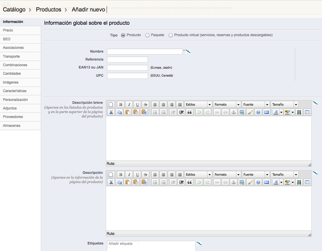 Xavievolution9 Posted February 20, 2014 Author Share Posted February 20, 2014 El idioma me aparece bien. Si mirais las fotos, esta en castellano todo. El problema es cuando por ejemplo creo un articulo. Cada vez que abro una de las pestañas " caracteristicas , trasnporte," donde hay que introducir una descripcion, el idioma que sale por defecto es el gallego. Y tengo que picar siempre en la banderita para cambiar a castellano. Antes no , antes salia la española, introducia texto y fuera. Ahora tengo que darle y cambiar. Y si no me acuerdo , he escrito en castellano una descripcion, en el "idioma gallego de la tienda" Link to comment Share on other sites More sharing options...