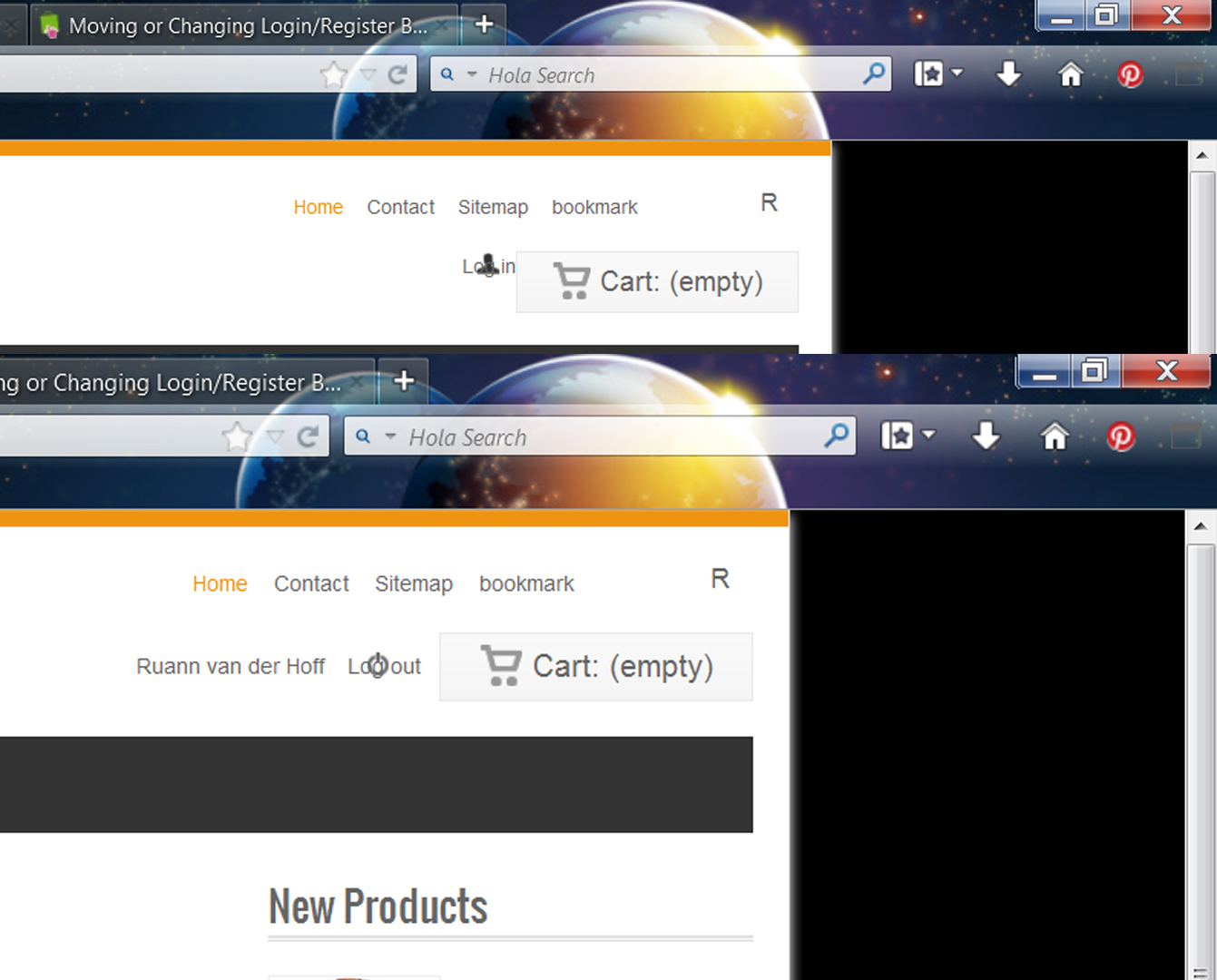 Ruann Posted February 25, 2014 Author Share Posted February 25, 2014 (edited) Hi Thanks for the help. I am getting there slowly. Please see attached screen shot. The login and log out image is over lapping the words. How do I move the Login/log out images slightly to the left? Also the Login is very close to the Cart Section, how can I move all of that slightly to the left? Edited February 25, 2014 by Ruann (see edit history) Link to comment Share on other sites More sharing options...