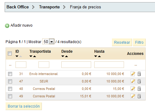 Miguel_SV Posted February 20, 2014 Share Posted February 20, 2014 Hola, quiero configurar los transportistas por franja de precios: Correos: de 0 a 15 €. SEUR: de 0 en adelante. Es decir si el pedido no llega a 15 € el cliente puede elegir entre ambas opciones, si pasa de 15 € solo puede elegir SEUR. Selecciono en franja de precios e indico estos límites a cada tranportista, parece sencillo pero a la hora de hacer el pedido siempre aparece la opción de Correos pese a que el pedido en el carrito sea mayor que de 15 €. ¿Dónde puede estar el problema para que no funcione? Saludos y gracias. Link to comment Share on other sites More sharing options...