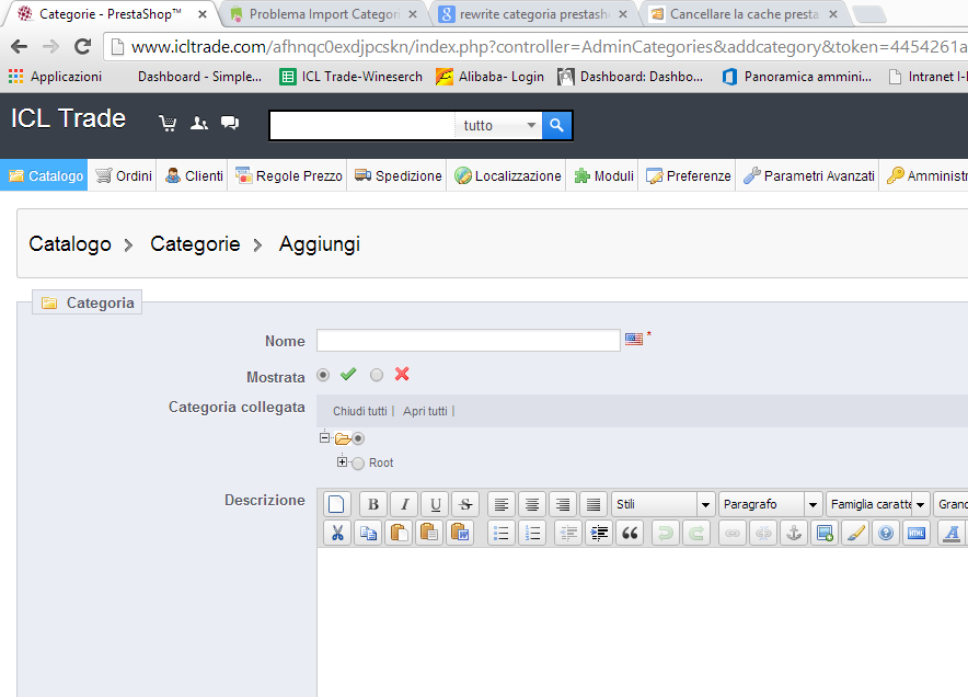 Crillit Posted February 21, 2014 Share Posted February 21, 2014 Buongiorno a tutti. E' il mio primo post che scrivo. Premetto che non sono un esperto, ma un autodidatta. Vi illustro il mio problema con la speranza che qualcuno mi aiuti. Sto cercando di inserire nel mio sito le categorie prodotti. Fino a poco tempo fa andava bene.. Poi non so dove ho modificato ed ora non riesco più a far visualizzare le categorie. In poche parole quando clicco su aggiungi nuovo vado a scrivere il titolo,mi esce cosi (guardare allegato per vedere meglio: Nome * Mostrata Categoria collegata Chiudi tutti| Apri tutti| Root Non riesco quindi ad inserire la categoria nella HOME PAGE.... Dove e cosa sbaglio??? Attendo vostro aiuto... Grazie Link to comment Share on other sites More sharing options...