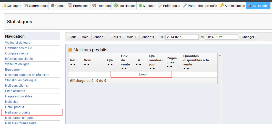 Whoami Posted February 21, 2014 Share Posted February 21, 2014 Bonjour, Le module de stats "Meilleurs produits" concerne les produits vendus, et non pas visités (si vous n'avez pas fait de vente, il est normal qu'il reste à "empty") Pour récupérer ce genre d'informations, ça risque d'être un petit peu compliqué si vous n'avez pas de compétences de développement (on va supposer que si) Le plus simple est de faire/trouver un module sur mesure, mais dans le cas ou cette option n'est pas envisageable Il va vous falloir : - Avoir activé les modules de tracking (Site Affluent > extrêmement gourmand en place et ressource) - Ca va créer des tables de tracking dans la base de donnée, dont je n'ai pas le nom sous la main - L'une d'entre elle va gonfler d'une manière abusive (1 ligne par page visitée et par utilisateur) - Il vous suffit après de brasser toutes les données de cette table et de parser le lien pour faire le calcul du nombre de lignes. Link to comment Share on other sites More sharing options...