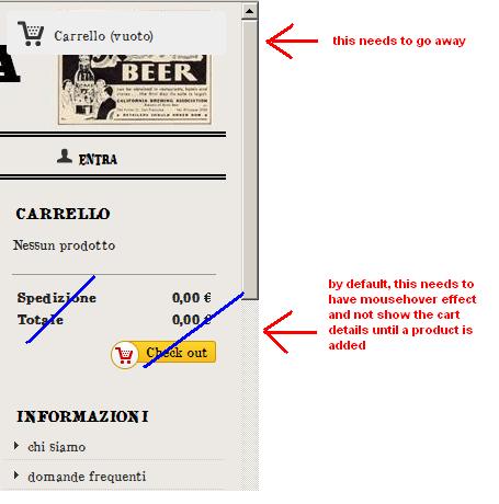 Enoteca Posted March 12, 2014 Author Share Posted March 12, 2014 (edited) Hi Vekia, good you are back here and available for some help. As you say, the cart becomes a real cart when products are added. What I'd like is that the cart in its "inactive/active" state, with its mousehover capability (i.e. like in the new image attached), is moved to the right column. In other words, it has to disappear from the header and stay on the right column even if it is empty of products. Edited March 12, 2014 by Enoteca (see edit history) Link to comment Share on other sites More sharing options...