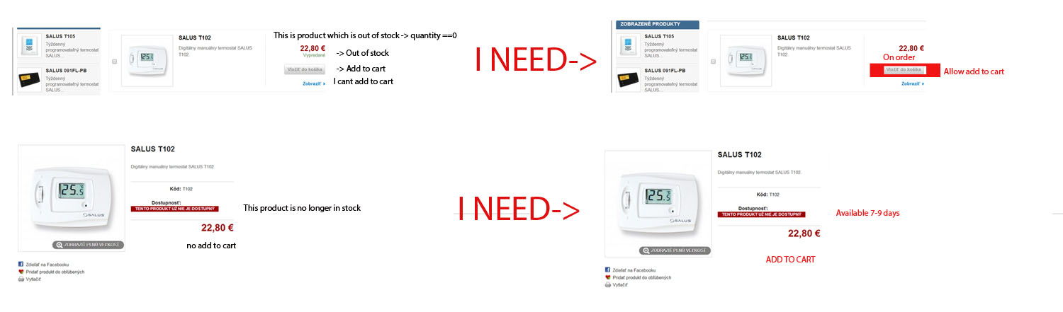 rambabuy Posted February 24, 2014 Share Posted February 24, 2014 Hello, i have a problem a i need a help. In my eshop i want to have 2 type of products. 1. Available and 2. On order. Products on order will not be in stock, but i will order this product in longer time ,if customer wants this product , for example 5-7 days. I try modify product-list. tpl but i dont know. Can you help me someone? Sorry for my bad english, but i am from slovakia and my english in not very good. rather than checking process, if product is out of stock just display a message "this product is out of stock will available after 7 days. Link to comment Share on other sites More sharing options...