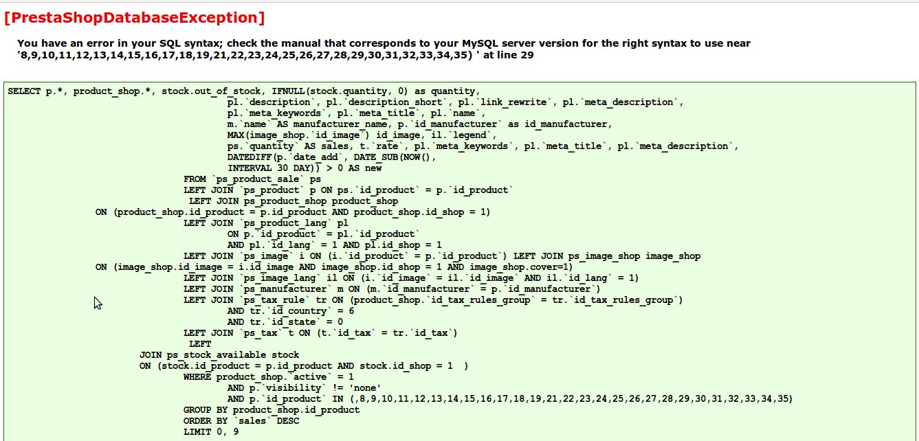Bravu Posted February 24, 2014 Share Posted February 24, 2014 (edited) Hola a todos. Necesito ayuda urgente con un problema al pinchar en el enlace de "Mejores Ventas" que tengo en el footer de mi página: http://tienda.aperseguridad.com Me sale un error que pone PrestashopDatabaseException que podéis ver aqui: http://tienda.aperseguridad.com/mas-vendidos Tengo unos conocimientos muy limitados en cuanto a bases de datos sql se refiere y no sé dónde prodría estar el error. Editado: Mi versión de Prestashop es 1.5.6.1 y la versión de mysql 5.1.73-cll Adjunto imagen con el error Muchas gracias de antemano. Edited March 10, 2014 by Bravu (see edit history) Link to comment Share on other sites More sharing options...
