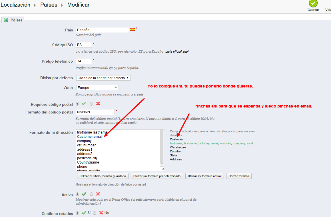 Josraso Posted February 25, 2014 Share Posted February 25, 2014 Vete a localizacion>paises y ahi le das a editar a españa, abajo veras un recuadro que pone Formato de la dirección añades el correo y le das a utilizar mi formato actual y despues a guardar, con esto ya te sale el mail tanto en los pedidos como en las facturas. Link to comment Share on other sites More sharing options...