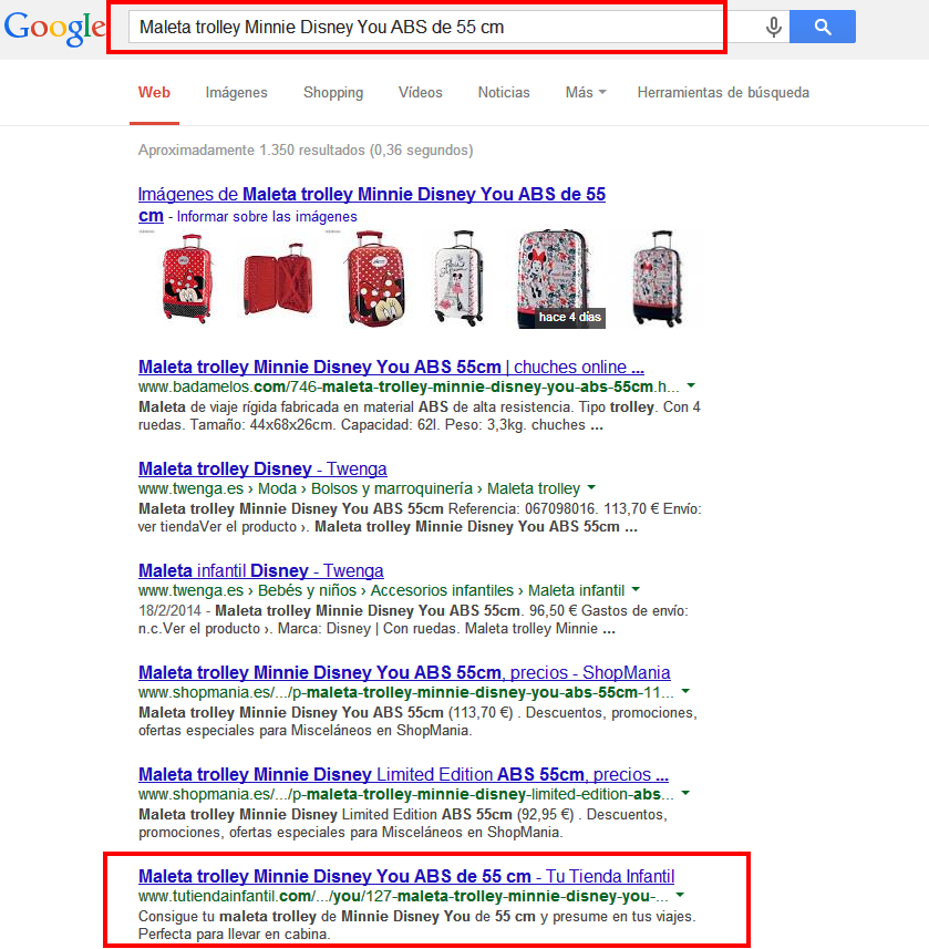 Josraso Posted February 25, 2014 Share Posted February 25, 2014 He estado mirando y si apareces en google, eso unas veces en la primera pagina otras mas lejos. Buscando como tu tienda infantil Sales asi Buscandote por el dominio tutiendainfantil.com sales asi y buscando por este producto Maleta trolley Minnie Disney You ABS de 55 cm sales asi Link to comment Share on other sites More sharing options...