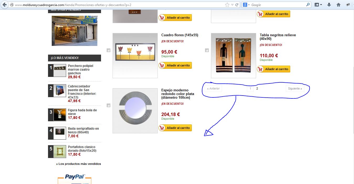 Como se puede apreciar en la imagen adjunta, la barra inferior de paginas no se coloca debajo del ultimo articulo pero esto solo ocurre cuando la lista de productos de una una categoria es impar.