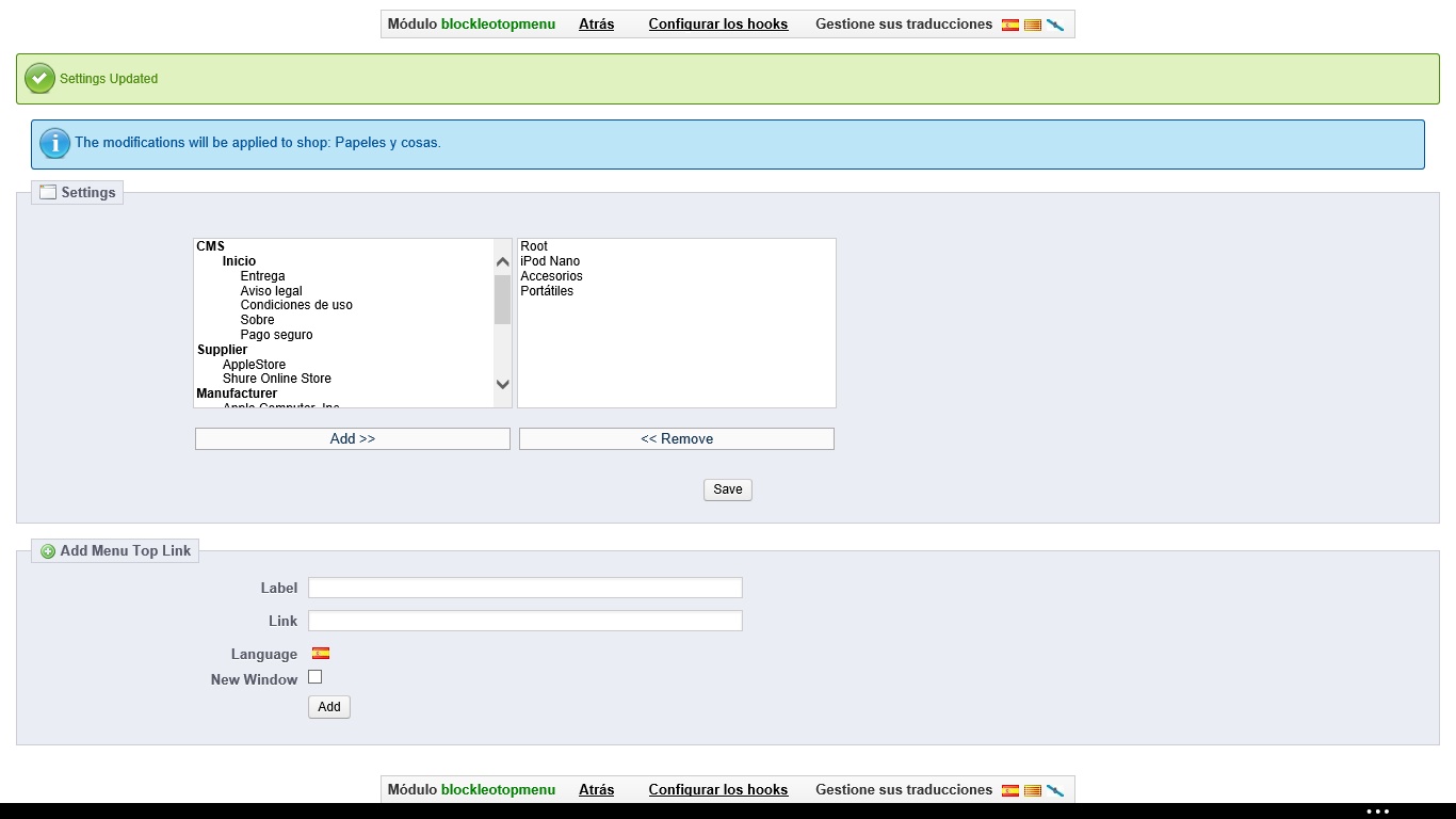 chucki Posted February 28, 2014 Share Posted February 28, 2014 (edited) Hola. He instalado el tema Leospot en prestasop 1.5.6.2 y no consigo poder cambiar las categorías del menú horizontal de la parte de arriba de la web. Ya he configurado el modulo con las categorías que me interesan. Le he dado a guardar y en la web no se cambia. Todo sigue igual que cuando instale el tema. Os dejo captura de la configuración del modulo y enlace a mi web. http://papelesycosas.hol.es Saludos. Edited February 28, 2014 by chucki (see edit history) Link to comment Share on other sites More sharing options...