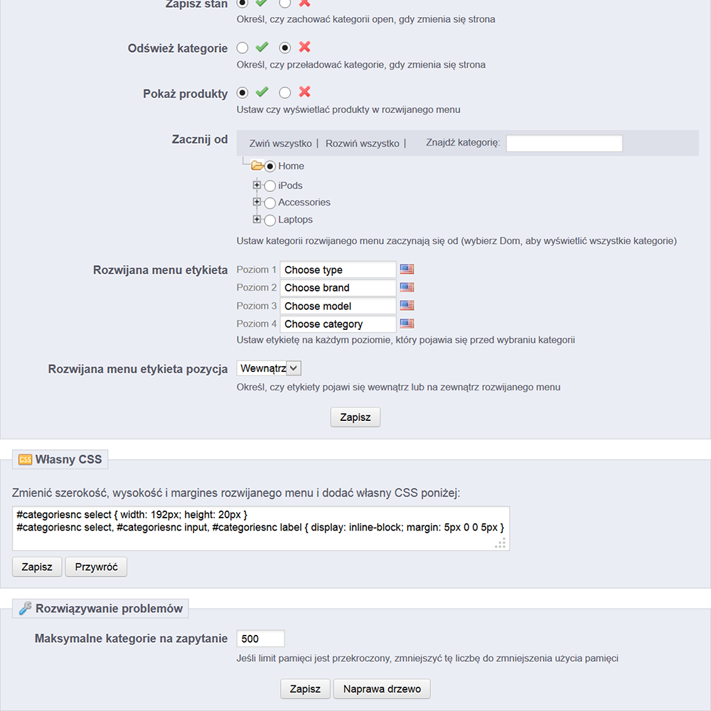 rocky Posted February 28, 2014 Share Posted February 28, 2014 Moduł ten wyświetla kategorie w rozwijanego menu zamiast strukturze drzewa i umożliwia podkategorii być dynamicznie ładowane do zmniejszenia czasu ładowania. Inne opcje obejmują wyświetlanie liczby produktów w każdej kategorii, ukrywanie pustych kategorii i zapisywanie stanu rozwijanego menu.Moduł ten jest przydatny do sklepów prowadzących sprzedaż części samochodowych, baterii laptopa lub cokolwiek innego wymagającego klienta, aby wybrać spośród tysięcy modeli produktów kupić osprzęt. Kupcy mogą korzystać z funkcji importu CSV w PrestaShop szybko dodać wszystkie marki i modele, sprawia, i moduł automatycznie generuje blok Wyszukiwarka produktów dzięki czemu klienci mogą szybko i łatwo wybrać modele.Więcej informacji w tym changelogu i linki do stron internetowych z wykorzystaniem modułu, zobacz stronę modułu tutaj. Oto link do zakupu modułu na PrestaShop Addons.Kompatybilny z PrestaShop v1.4.x, v1.5.x i v1.6.x Link to comment Share on other sites More sharing options...