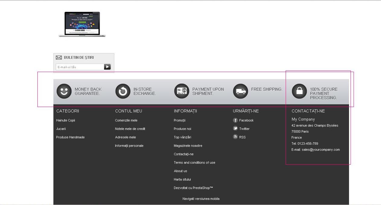 standdowncafe Posted March 1, 2014 Share Posted March 1, 2014 Hello everyone, glad to get in here finally. I just bought myself a domain, and hosting and I am trying to work with default prestashop theme. I kinda' found all i needed till now except few things. Maybe will look stupid to you but i need help with some basics 1. How do I edit address details - see picture with marked area 2. How do I edit the bar containing - Money back guarantee, etc... - see picture with marked area 3. How do i changes pictures from center of the theme - see picture with marked area 4. how do I remove, or change picture for my store contact - see picture Thank you for your support Link to comment Share on other sites More sharing options...