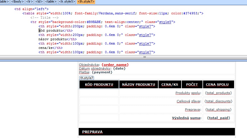 totallighting.sk Posted March 4, 2014 Share Posted March 4, 2014 Dobre rano, Aktualne sa snazim riesti email sablonu: order_conf.html! Prikladam Vam html: <!DOCTYPE html PUBLIC "-//W3C//DTD HTML 4.01//EN" "http://www.w3.org/TR/1999/REC-html401-19991224/strict.dtd"> <html> <head> <meta http-equiv="Content-Type" content="text/html; charset=utf-8"> <meta http-equiv="Content-Language" content="sk"> <title>Message from {shop_name}</title> <style type="text/css"> a { color: #000000; } a:visited { color: #000000; } a:active { color: #000000; } .style1 { color: #FF0000; } .style3 { text-transform: uppercase; font-weight: bold; font-size: 12px; color: #FFFFFF; background-color: #000000; } .style4 { background-color: #000000; } .style5 { color: #FFFFFF; } .style6 { background-color: #FFFFFF; } .style7 { text-transform: uppercase; background-color: #000000; } .style8 { text-align: center; } .style9 { font-weight: bold; } </style> </head> <body> <table style="font-family: Verdana,sans-serif; border: 1px solid #ccc; border-radius: 3px; box-shadow: 0 0 5px #888; font-size: 11px; color: #374953; width: 550px;" align="center"> <tbody> <tr> <td align="left" style="width: 700px"> <a href="{shop_url}" title="{shop_name}"><img alt="{shop_name}" src="{shop_logo}" style="border:none;" ></a> </td> </tr> <tr><td style="width: 700px"> </td></tr> <tr> <td align="left" style="width: 700px">Dobrý deň <strong class="style1">{firstname} {lastname}</strong>,<br /><br /> Ďakujeme za Vašu objednávku v obchode <strong>{shop_name}</strong>!</td> </tr> <tr><td style="width: 700px"> </td></tr> <tr> <td align="left" style="padding: 0.5em 1em; width: 700px;" class="style3"> Detail vašej objednávky</td> </tr> <tr><td style="width: 700px"> </td></tr> <tr> <td align="left" style="width: 700px"> Objednávka: <strong><span class="style1">{order_name}</span> <br> </strong> Dátum objednávky: <strong>{date}</strong> <br >Platba: <strong>{payment}</strong> </td> </tr> <tr><td style="width: 700px"> </td></tr> <tr> <td align="left"> <table style="width:100%; font-family:Verdana,sans-serif; font-size:11px; color:#374953;"> <!-- Title --> <tr style="background-color:#B9BABE; text-align:center;" class="style5"> <th style="width:200px; padding: 0.6em 0;" class="style7"> kód produktu</th> <th style="width:200px; padding: 0.6em 0;" class="style7"> názov produktu</th> <th style="width:100px; padding: 0.6em 0;" class="style7"> cena/ks</th> <th style="width:100px; padding: 0.6em 0;" class="style7"> počet</th> <th style="width:100px; padding: 0.6em 0;" class="style7"> cena spolu</th> </tr> <!-- Products --> {products} {discounts} <!-- Footer: prices --> <tr style="text-align:right;"> <td style="width: 200px"> </td> <td colspan="3" style="padding:0.6em 0.4em;">Produkty spolu:</td> <td style="padding:0.6em 0.4em; width: 100px;" class="style8">{total_products}</td> </tr> <tr style="text-align:right;"> <td style="width: 200px"> </td> <td colspan="3" style="padding:0.6em 0.4em;">Celková zľava:</td> <td style="padding:0.6em 0.4em; width: 100px;" class="style8">{total_discounts}</td> </tr> <tr style="text-align:right;"> <td style="width: 200px"> </td> <td colspan="3" style="padding:0.6em 0.4em;">Preprava:</td> <td style="padding:0.6em 0.4em; width: 100px;" class="style8">{total_shipping}</td> </tr> <tr style="text-align:right; font-weight:bold;"> <td style="width: 200px"> </td> <td colspan="3" style="padding:0.6em 0.4em;" class="style9"> Výsledná suma:</td> <td style="padding:0.6em 0.4em; width: 100px;" class="style8">{total_paid}</td> </tr> </table> </td> </tr> <tr><td style="width: 700px"> </td></tr> <tr> <td align="left" style="padding: 0.5em 1em; width: 700px;" class="style3"> Preprava</td> </tr> <tr><td style="width: 700px"> </td></tr> <tr> <td align="left" style="width: 700px"> Prepravca: <strong>{carrier}</strong> </td> </tr> <tr><td style="width: 700px"> </td></tr> <tr> <td> <table style="width:100%; font-family:Verdana,sans-serif; font-size:11px; color:#374953;"> <tr style="background-color:#B9BABE; text-transform:uppercase;" class="style5"> <th style="text-align:left; padding: 0.3em 1em; width: 350px;" class="style4"> Dodacia adresa</th> <th style="text-align:left; padding: 0.3em 1em; width: 350px;" class="style4"> fakturačná adresa</th> </tr> <tr> <td style="padding:0.5em 0 0.5em 0.5em; " class="style6"> {delivery_block_html} </td> <td style="padding:0.5em 0 0.5em 0.5em; "> {invoice_block_html} </td> </tr> </table> </td> </tr> <tr><td style="width: 700px"> </td></tr> </table> </body> </html> Problem je v tom, ze v editore mail sablona vyzera upne inac ako v doslej poste zakaznika. Mail sablony nema instalovane v adresary sablony, iba v korenovom adresary. Dalej neviem, ako mam zarovnat vypis produktov, cien atd na stred v email potvrdeni... Link to comment Share on other sites More sharing options...