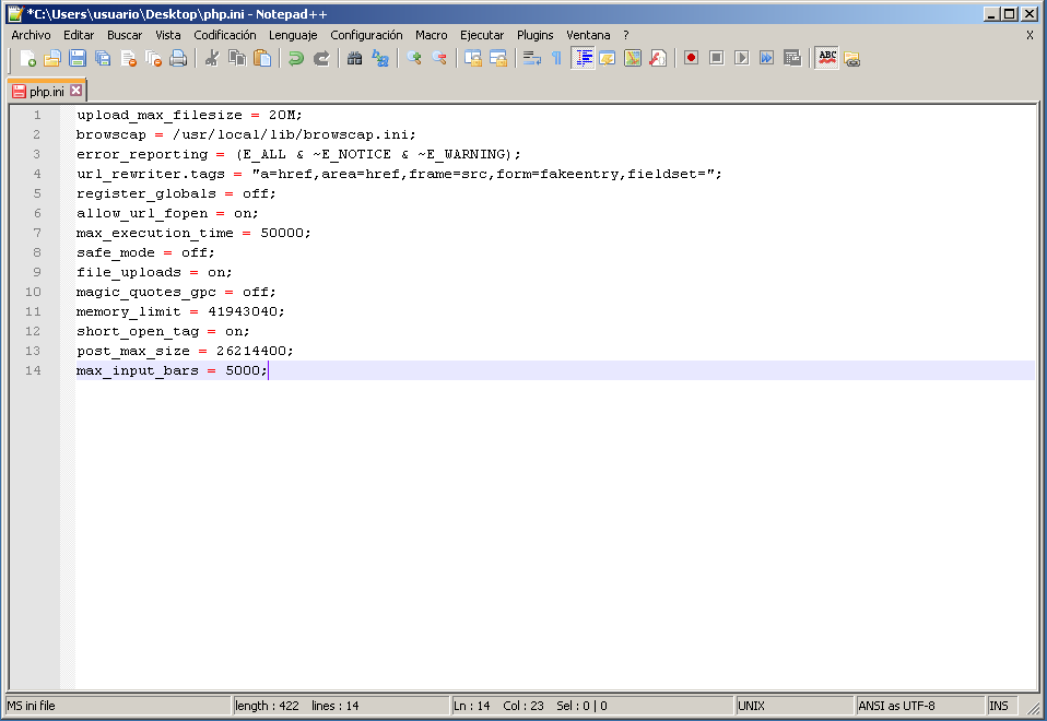 Otra cosa que no me queda clara es como hay que escribir en el php.ini, supongo que esta es la manera correcta ahora que me he instalado notepad++. (Adjunto otra captura).