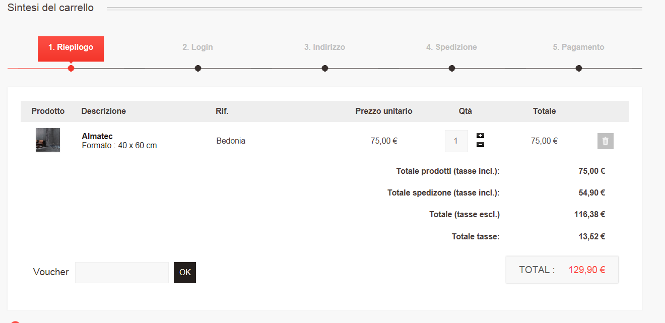 1) Come vedete in prima pagina, il prodotto ha il valore della combinazione di Default ed è esattamente 75euro. Se ci spostiamo nella categoria "Pavimenti e Rivestimenti" lo stesso prodotto mi viene dato a 120,14 euro (valore della combinazione più alta).