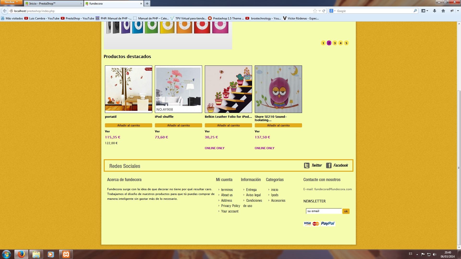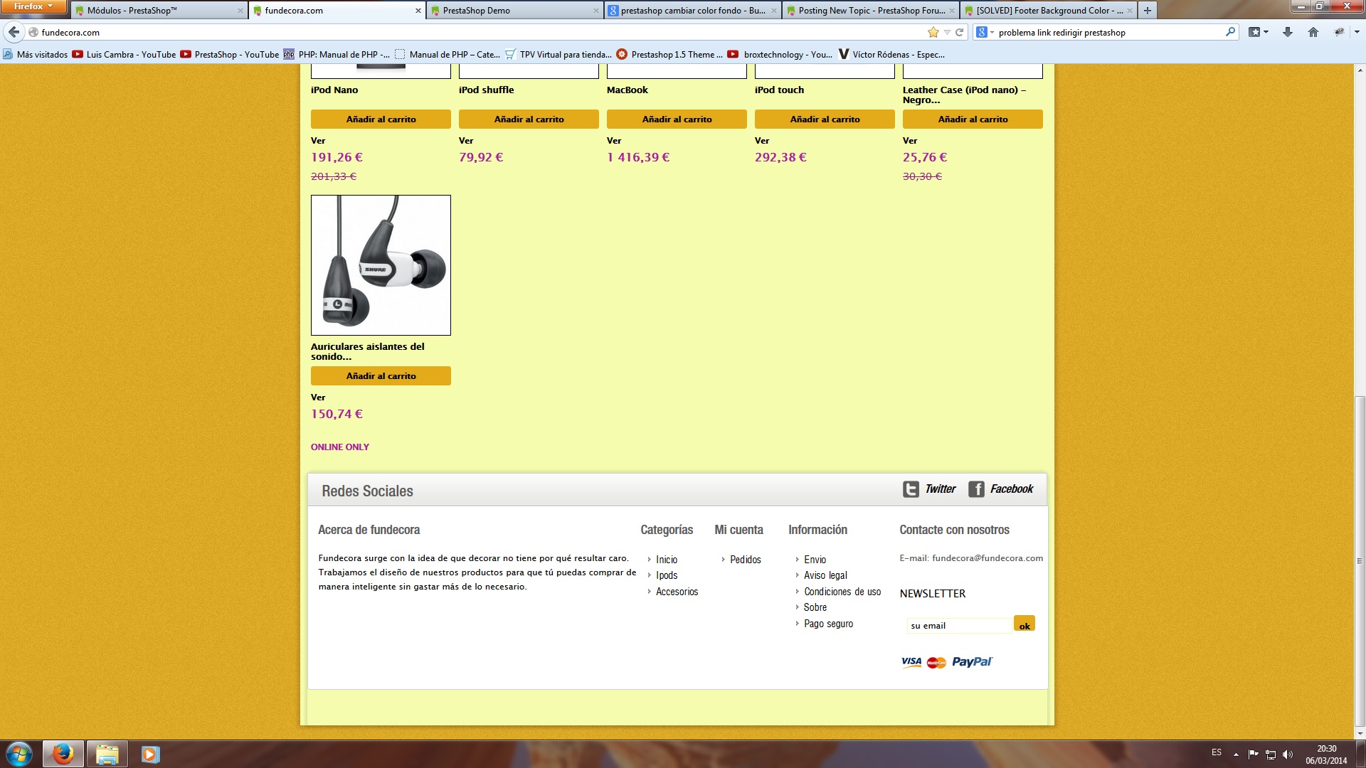 alferdo22 Posted March 6, 2014 Share Posted March 6, 2014 Hola a todos!!! Llevo poco tiempo con esto del prestashop y me he quedado atascado. Instalé el módulo lof advance footer porque necesitaba meter otros módulos en el footer y éste lo permitía. Lo probé en local y por medio de firebug lo conseguí dejar medio apañado, así que lo instalé. El problema viene cuando he querido hacer lo mismo en el servidor. Al parecer el color viene asociado a una imagen y al quitarla además de perder el fondo(y conseguir el color deseado) desaparecen un montón de elementos. No sé si alguien me puede echar una manilla porque no sé qué puedo hacer. Dejo un par de capturas, una del módulo tal esta; y otro de lo que conseguí con el firebug pero no soy capaz de hacer. Muchas gracias Link to comment Share on other sites More sharing options...
