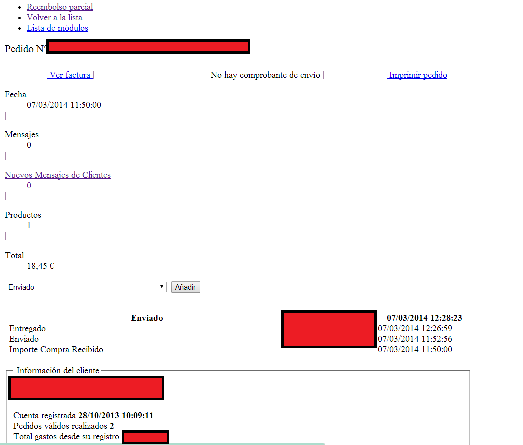 Se ha realizado un pedido y al entrar en el para realizar la gestión (marcar como enviado..etc) salen solo líneas de texto y faltan casi todos los elementos ¿habéis tenido alguno un caso similar?