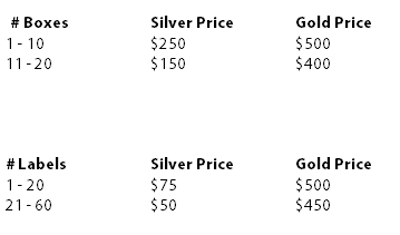 So, if I select Gold, with 2 boxes and 25 labels, price would be 2 x 500 + 25 x 450. Any ideas how this would be possible? See pic of the table attached. Thanks a lot for any help in advance, I would really appreciate it.