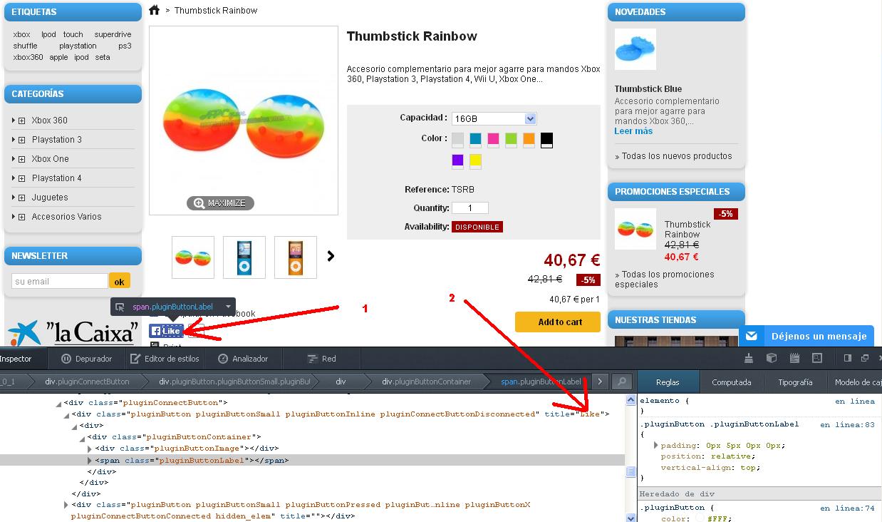 marvarez Posted March 7, 2014 Share Posted March 7, 2014 (edited) Hola, tengo una duda que por mas vueltas que le doy, no soy capaz de solucionar. mi web es: http://accesoriosparaconsolasymas.es/prestashop En el archivo 1.jpg me gustaría centrar la foto que sale en la pantalla de inicio En el archivo 2.jpg, en la flecha numero 1, sale el boton de "me gusta" en inglés, es decir "like", he visto que con el inspeccionador de elementos se puede cambiar el texto, pero no sé que archivo tengo que modificar para ello, me gustaría que alguien me dijese a qué archivo tengo que acceder porque por más que busco, no lo encuentro :-( Instalé un módulo de Facebook, pero he entrado a todos los archivos de ese módulo y no veo el mismo código que sale en el inspeccionador... Básicamente, esas son mis dudas. Les estaría muy agradecido. Y ya de paso... qué os parece la web? Saludos y gracias!! Edited March 9, 2014 by markezmarkez (see edit history) Link to comment Share on other sites More sharing options...