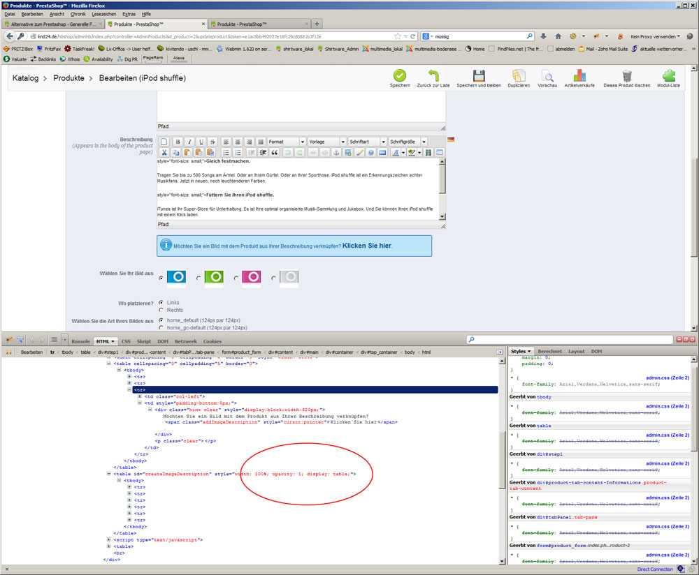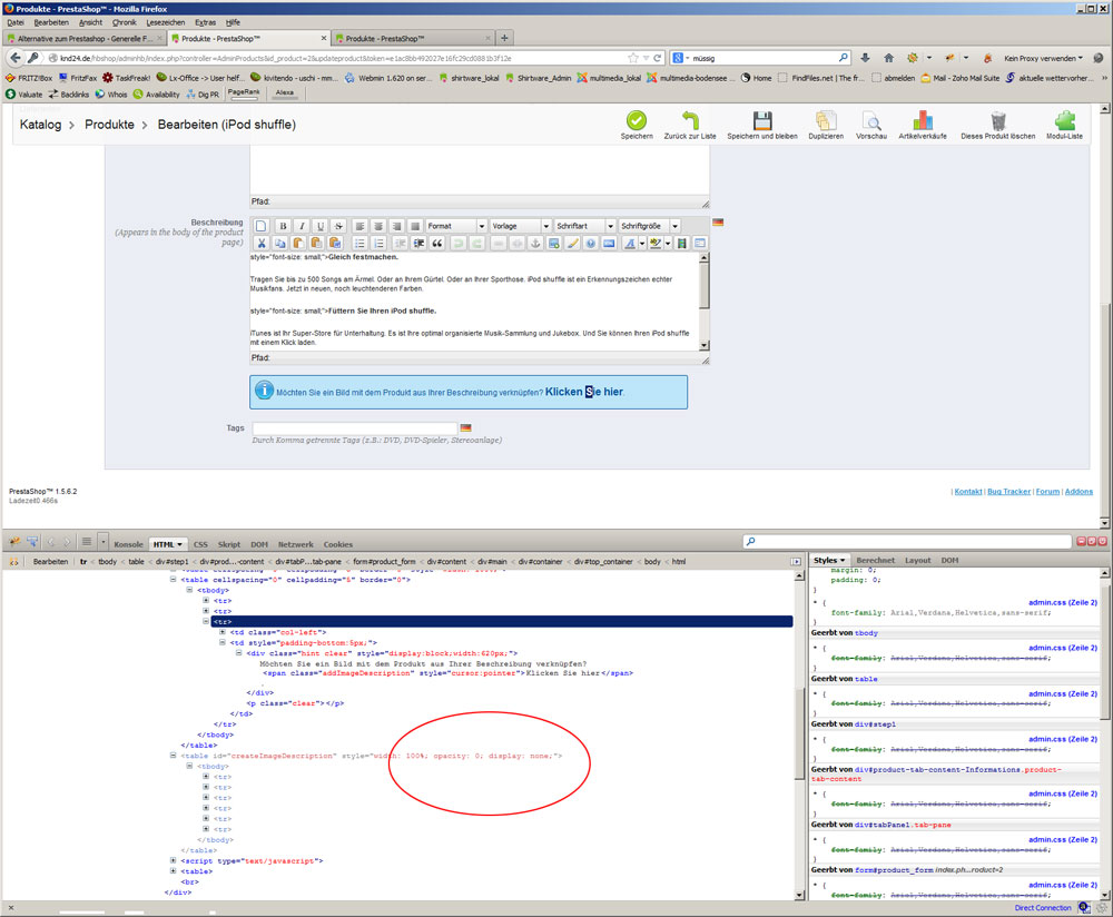 hbriele Posted March 1, 2014 Author Share Posted March 1, 2014 denke, um dir hier konkrete Hilfe zu geben, müsstest du mal einen Screenshot machen von diesem Problem und hier reinposten, weil so ist es ein wenig schwierig für uns.Ist schwierig wenn die Anzeige nur eine Sekunde da ist.Am besten selber Schaun. Http:/knd24.de/hbshop/adminhb User [email protected] Passwort 12345678 Dann z.B. Katalog - Produkte IPod nano id1 anzeigen lassen und ganz nach unten scrollen und Für Bilder....... Klichen Sie hier betätigen. Ich kann doch nicht der einzige sein, bei dem die Bilder dann nur eins Sekunde zu sehen sind. Gruß Link to comment Share on other sites More sharing options...